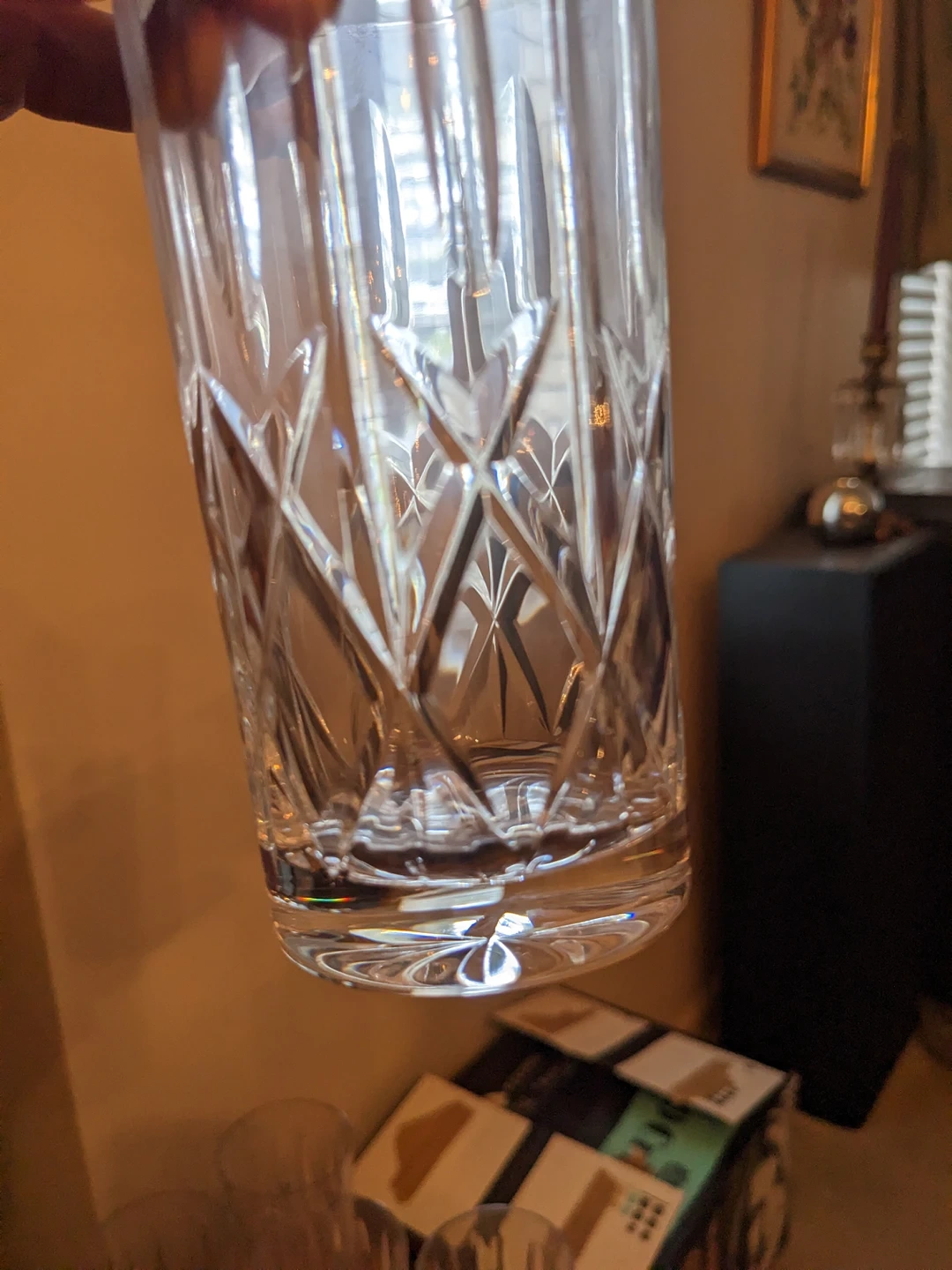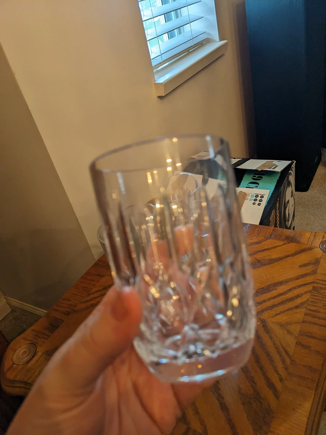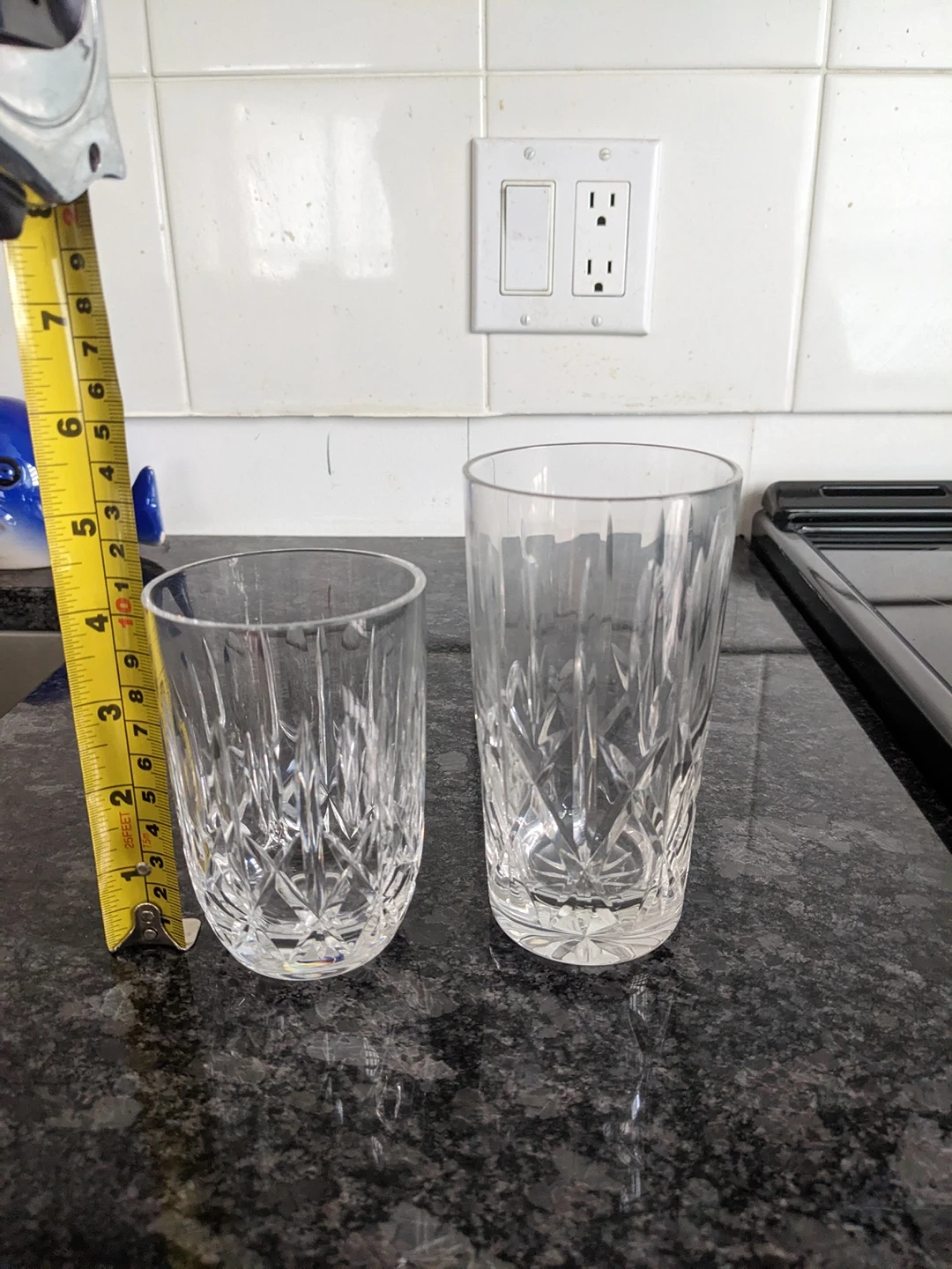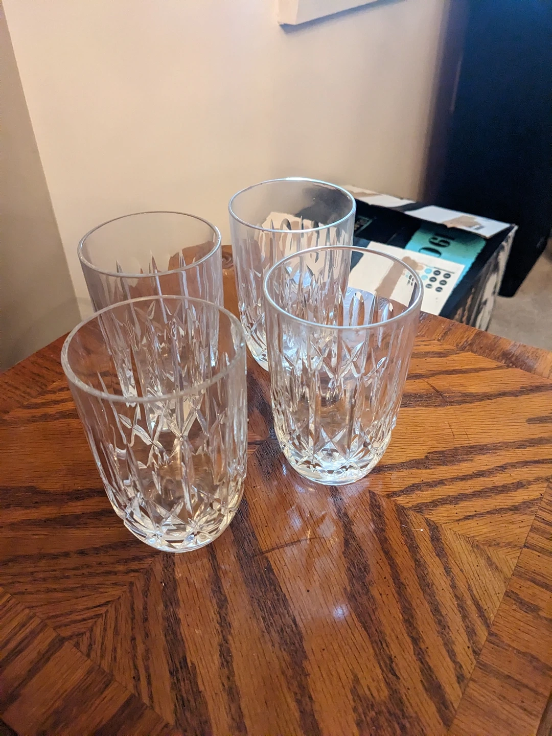A total of 12 glasses, cut crystal... 8 tall glasses (holds approx 12 ounces), 4 shorter glasses (holds approx 10 ounces).