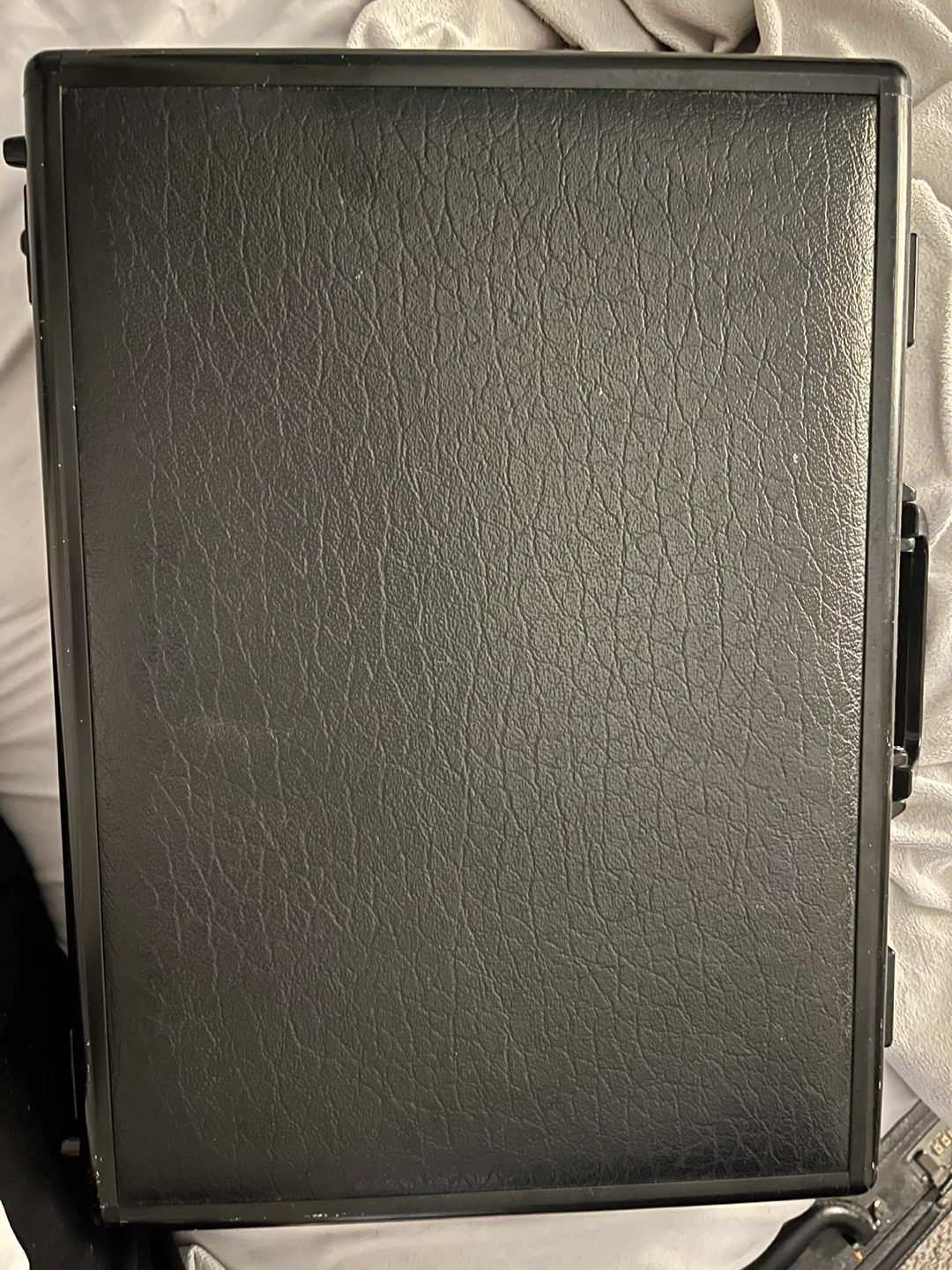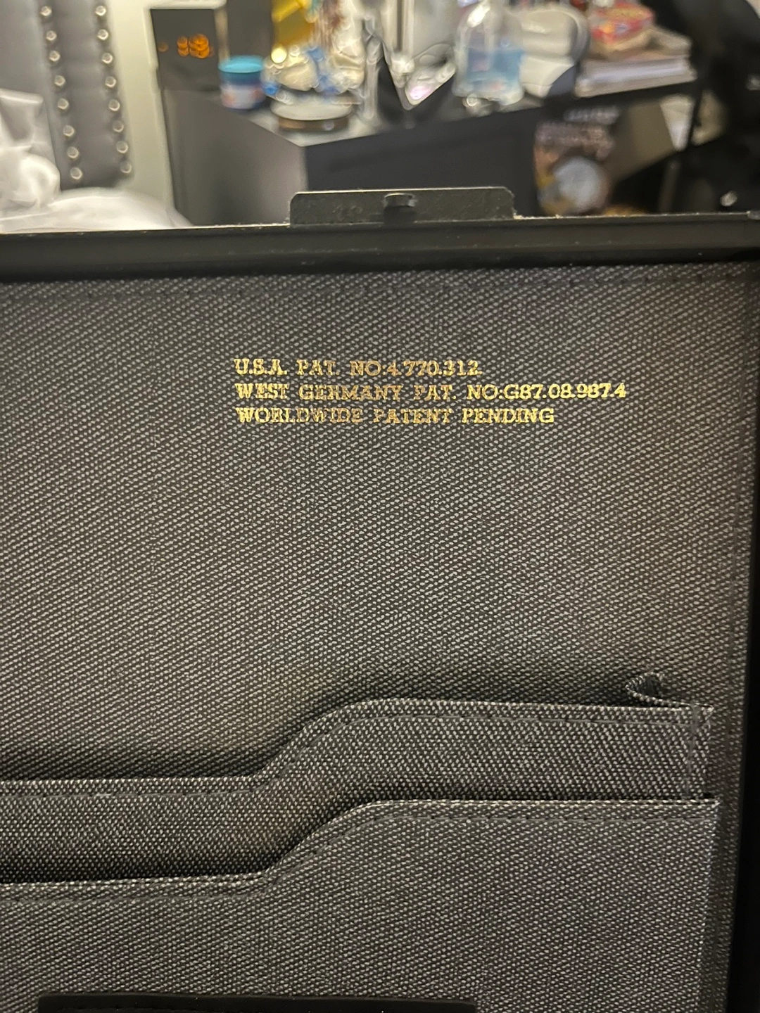Selling a vintage black briefcase. It's a hard case style, perfect for keeping your documents and items secure. The inside has compartments for organizing your things. It has a U.S.A. patent number 4,770,312 and a West Germany patent number G87.08.987.4. Worldwide patent pending