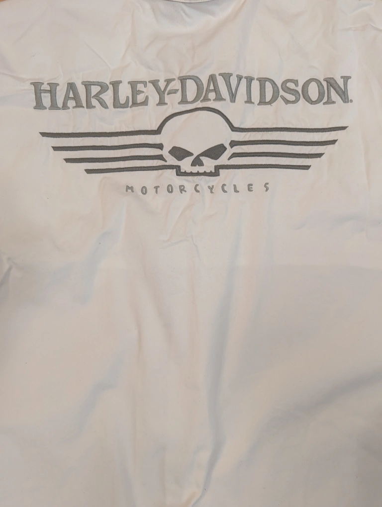 Authentic Harley-Davidson men's short sleeve button-up shirt in crisp white. Features bold embroidered Harley-Davidson branding on both the front chest pocket and across the back, including the iconic skull logo and winged “Motorcycles” design. Made from lightweight, breathable material—perfect for riding or casual wear. Size XL. In excellent pre-owned condition with no rips, stains, or flaws.