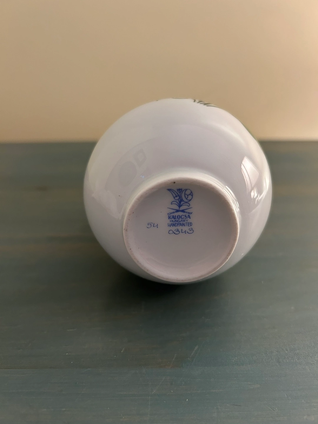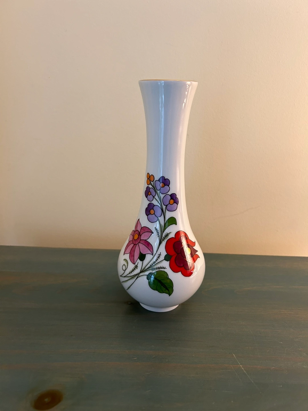 Beautiful Hand Painted Floral Pattern Vase of Kalocsa Hungary with elegant gold trim. Vibrant colours. Vase is marked and numbered at bottom 8” high x3” wide at widest point.