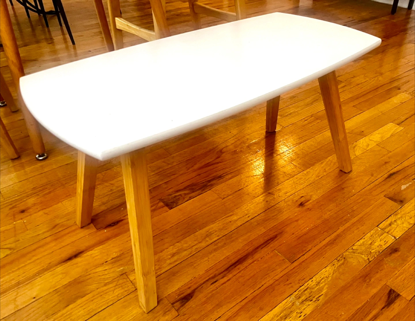 Selling a cute coffee table with a white top and wooden legs. It's sturdy, in good condition and would look great in any living room or apartment!