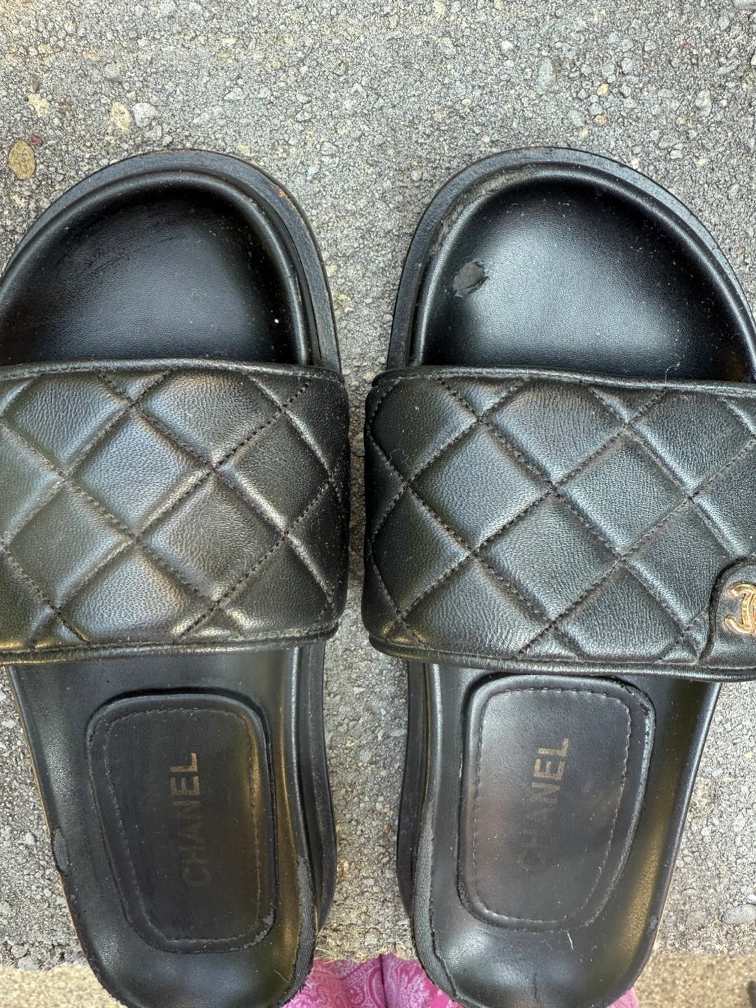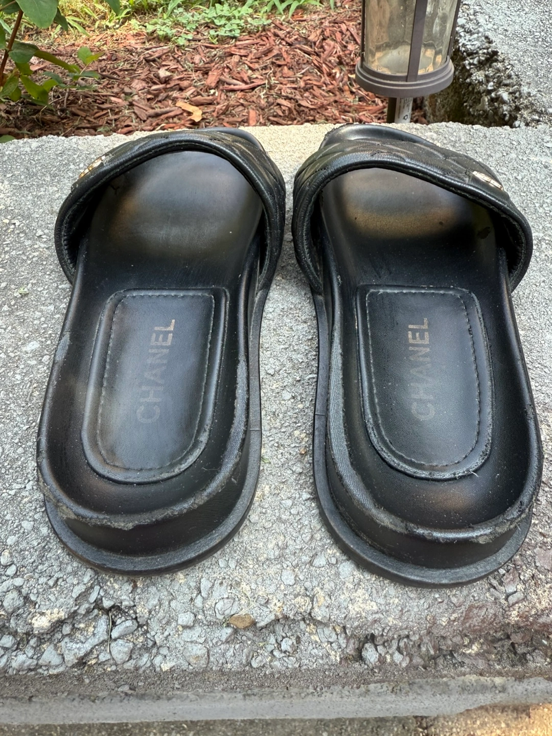 Selling a pair of Chanel black quilted slides. They show signs of wear, as pictured, but still have lots of life left!