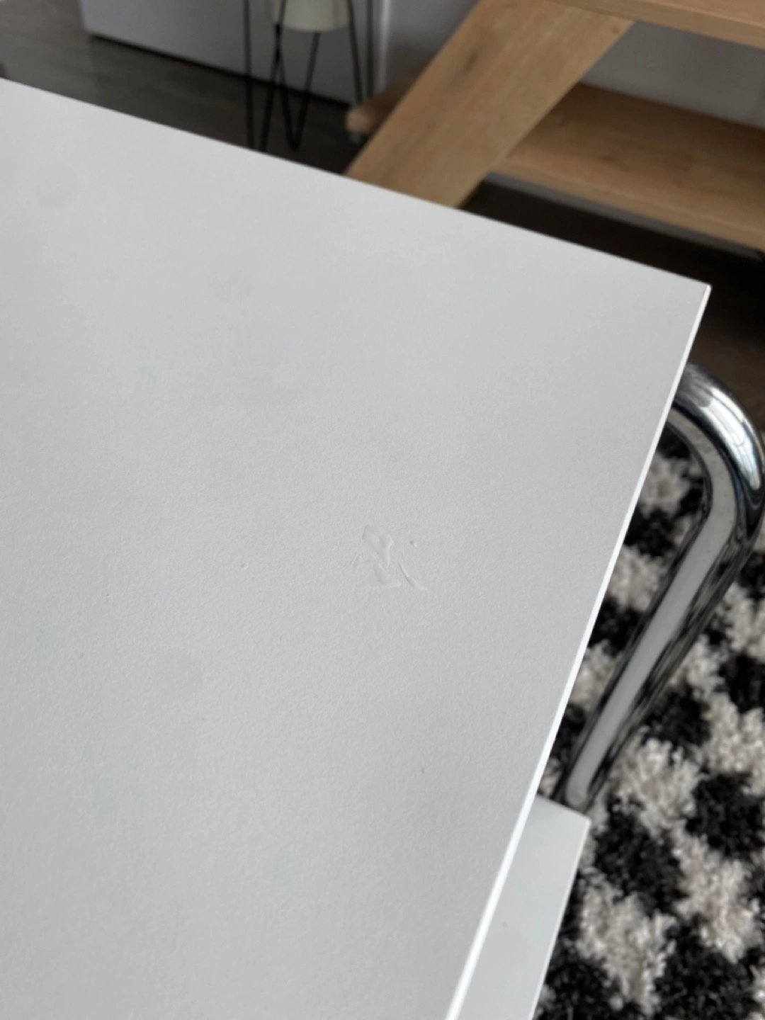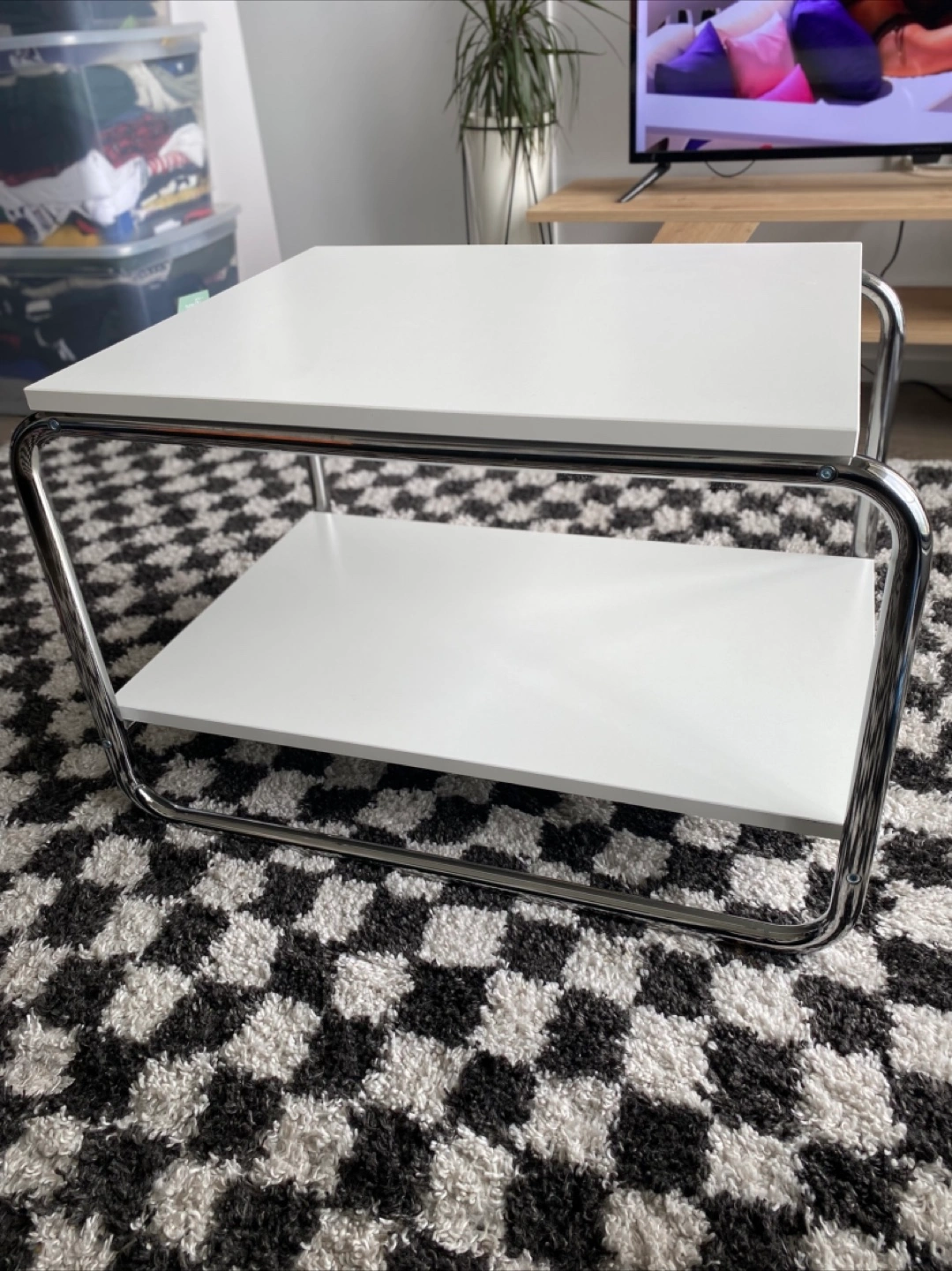 Selling a stylish white coffee table with a chrome frame. It has a modern look that would fit in any living room. There is a small scratch on the top surface as shown in the picture.