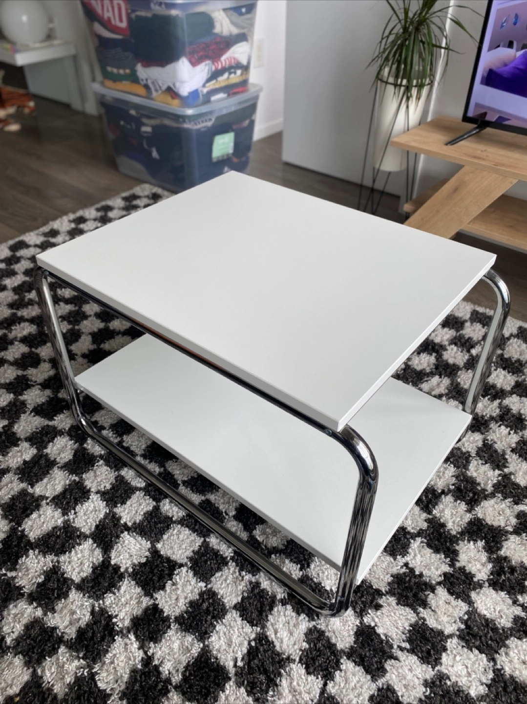 Selling a stylish white coffee table with a chrome frame. It has a modern look that would fit in any living room. There is a small scratch on the top surface as shown in the picture.