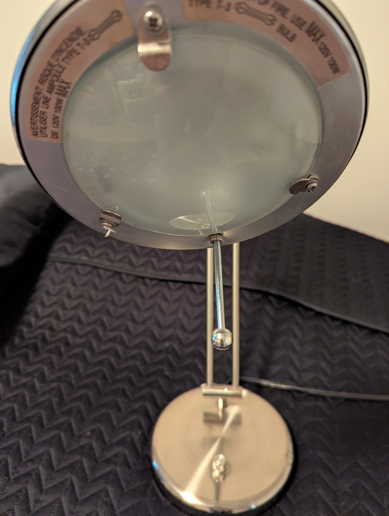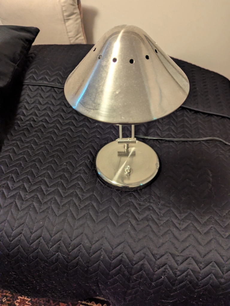 Small silver toned table or desk lamp in very good condition. Provides a good light source for a side table or desk. With extendable arm.