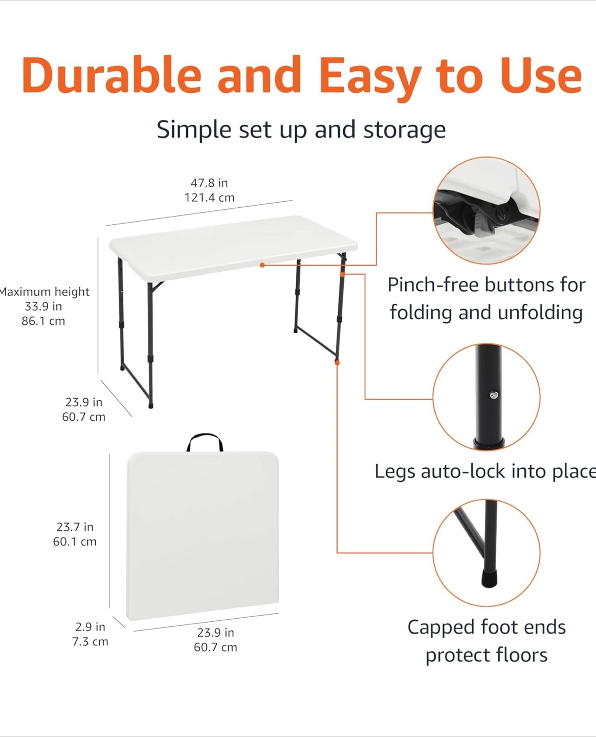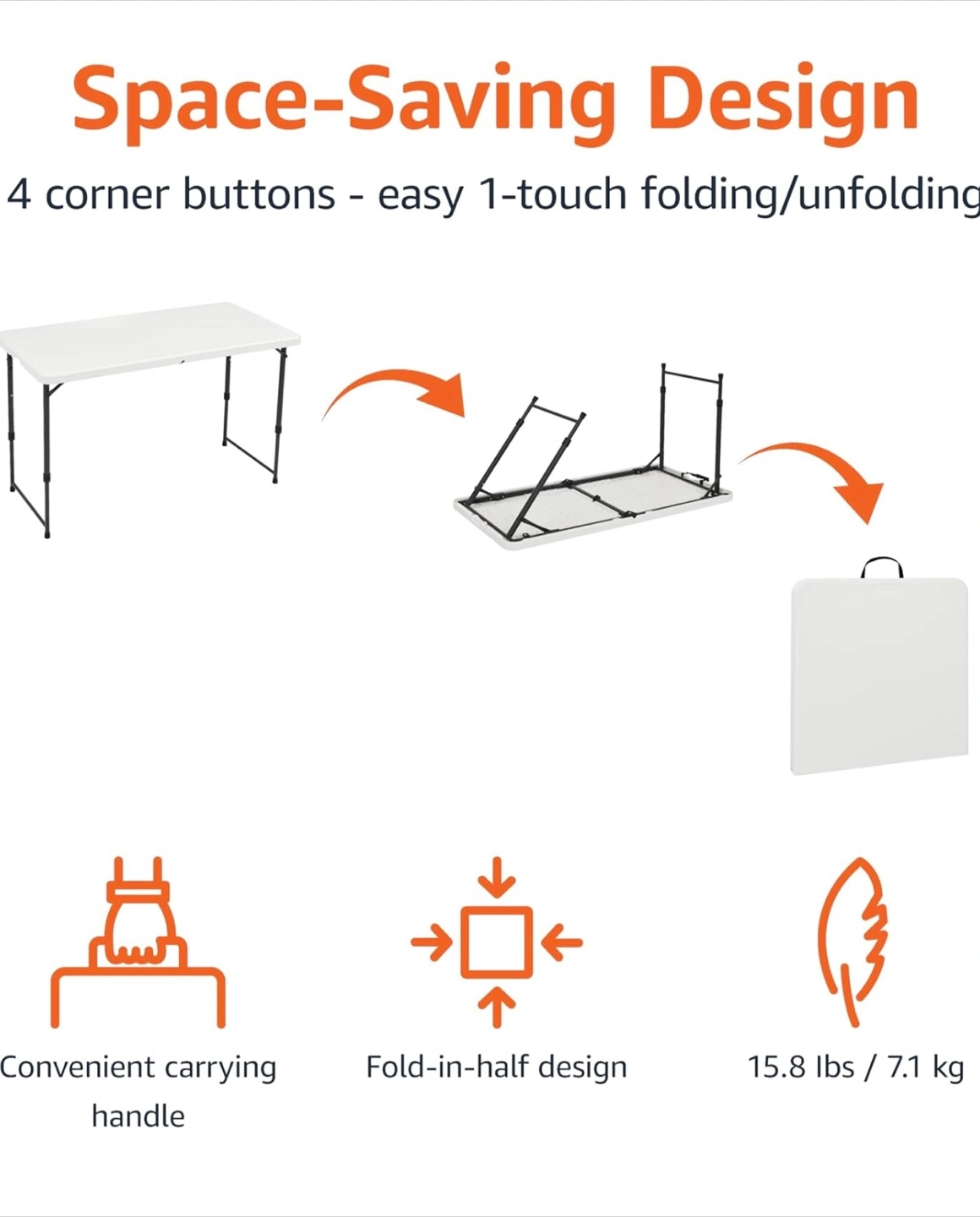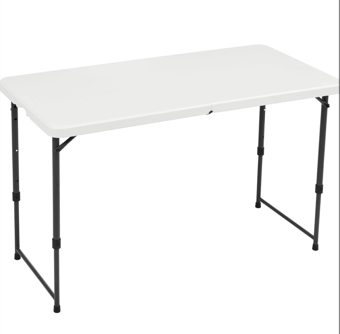 Selling a handy foldable table! It's white with black legs and folds in half for easy storage. The legs also lock into place for extra stability. Perfect for crafting, games, or extra dining space