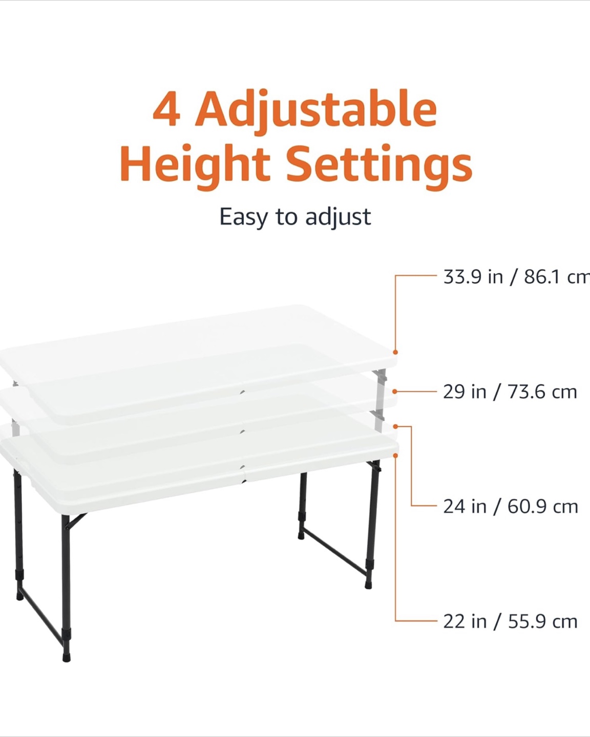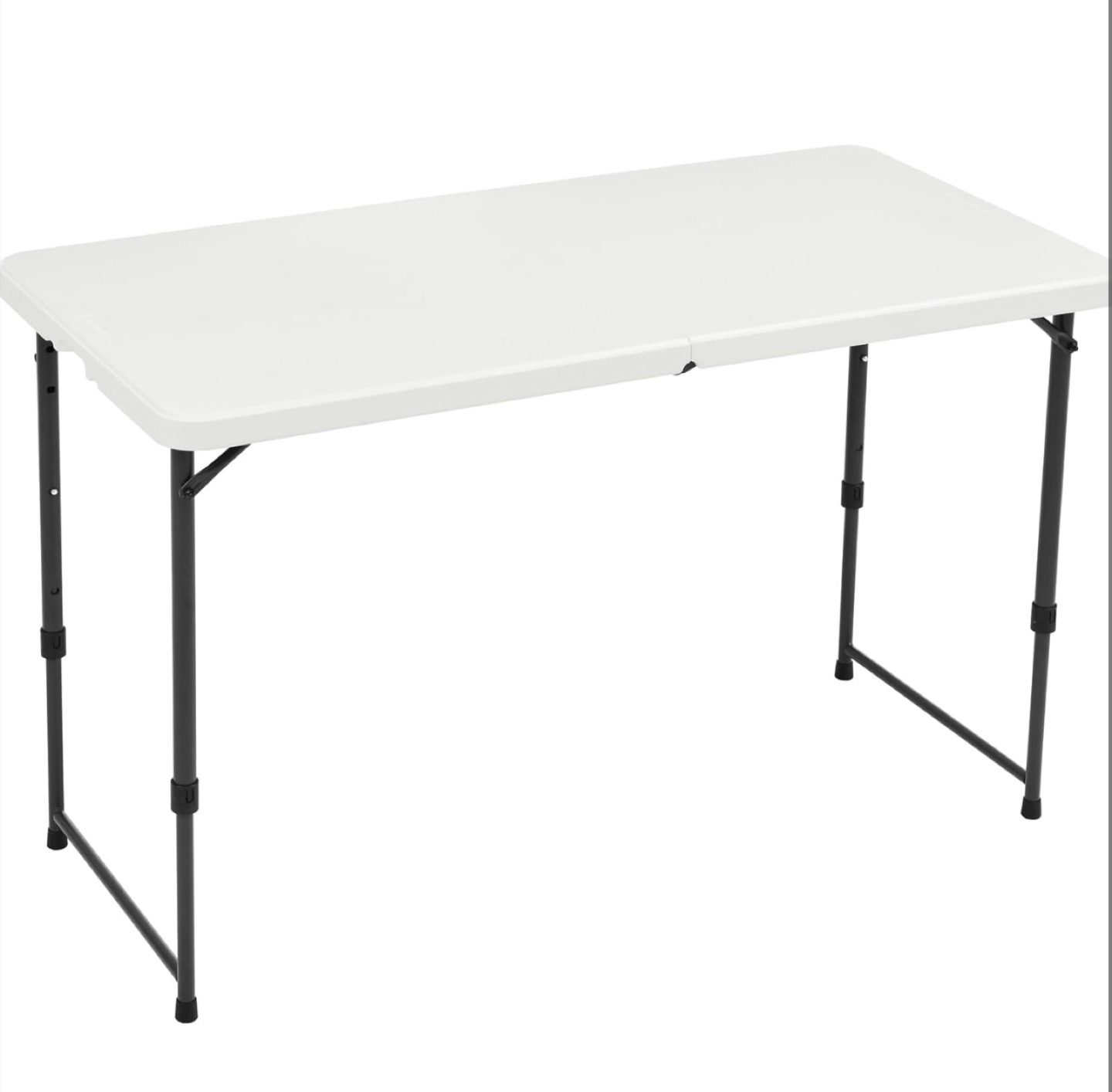 Selling a handy foldable table! It's white with black legs and folds in half for easy storage. The legs also lock into place for extra stability. Perfect for crafting, games, or extra dining space