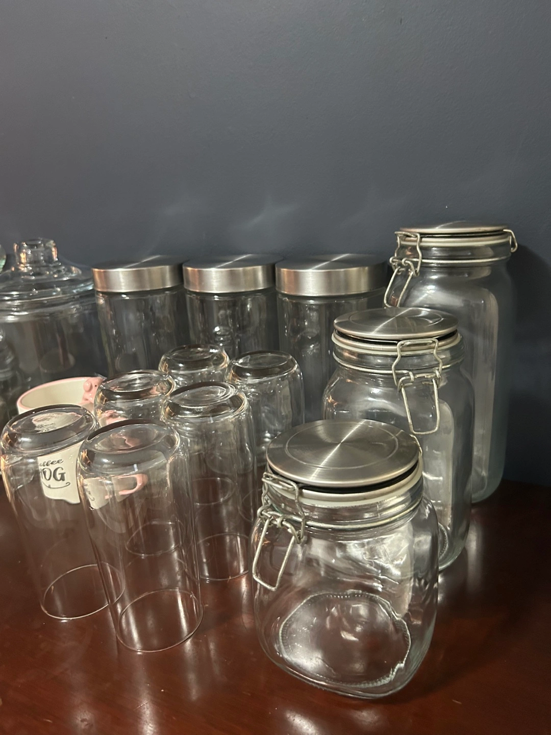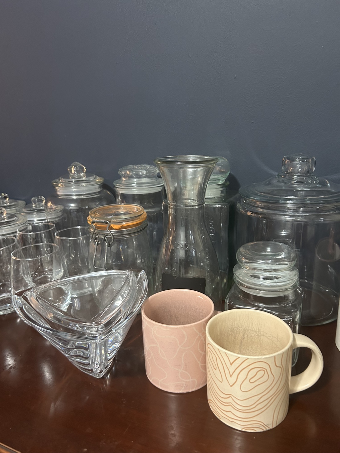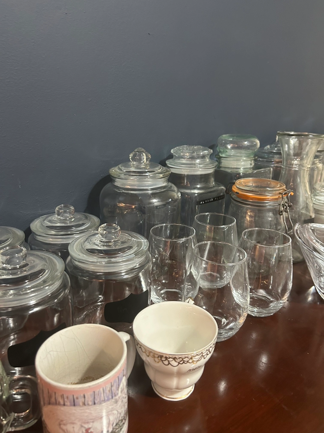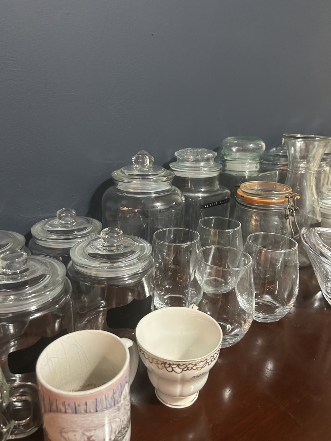 Selling a variety of glassware and jars - wine glasses, mugs, and storage jars & candy dish, all of different sizes and styles.