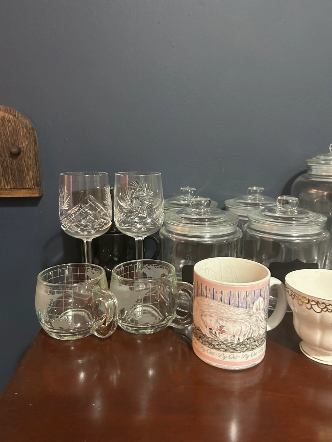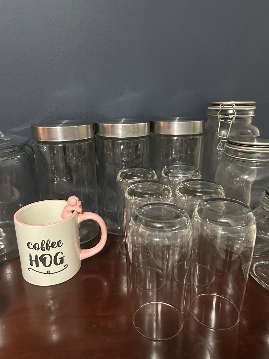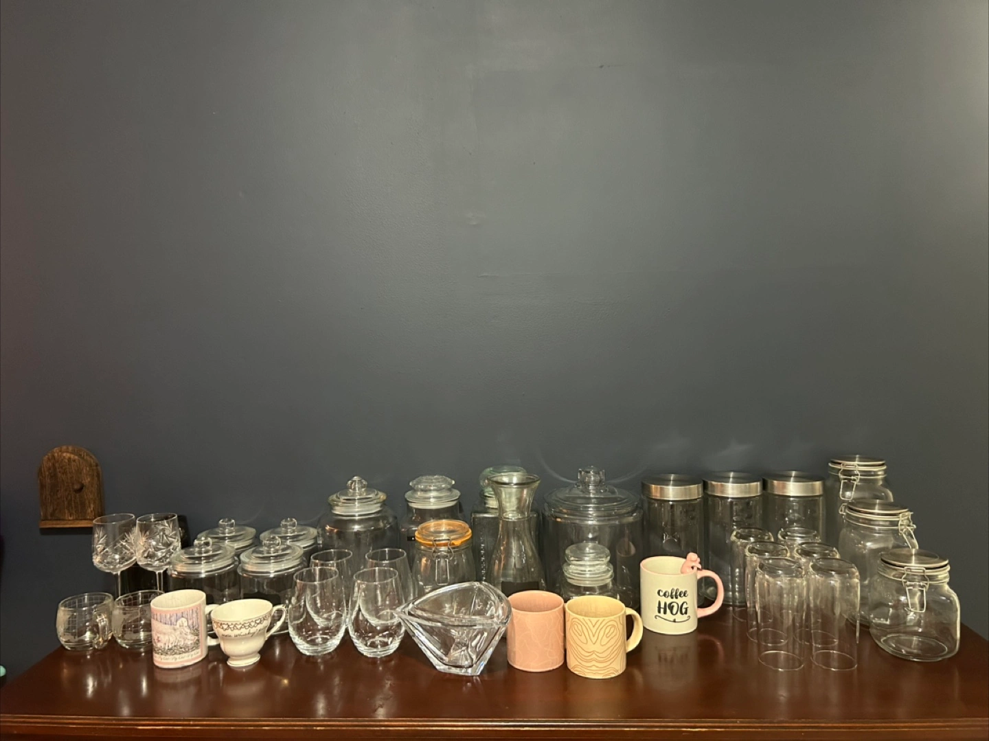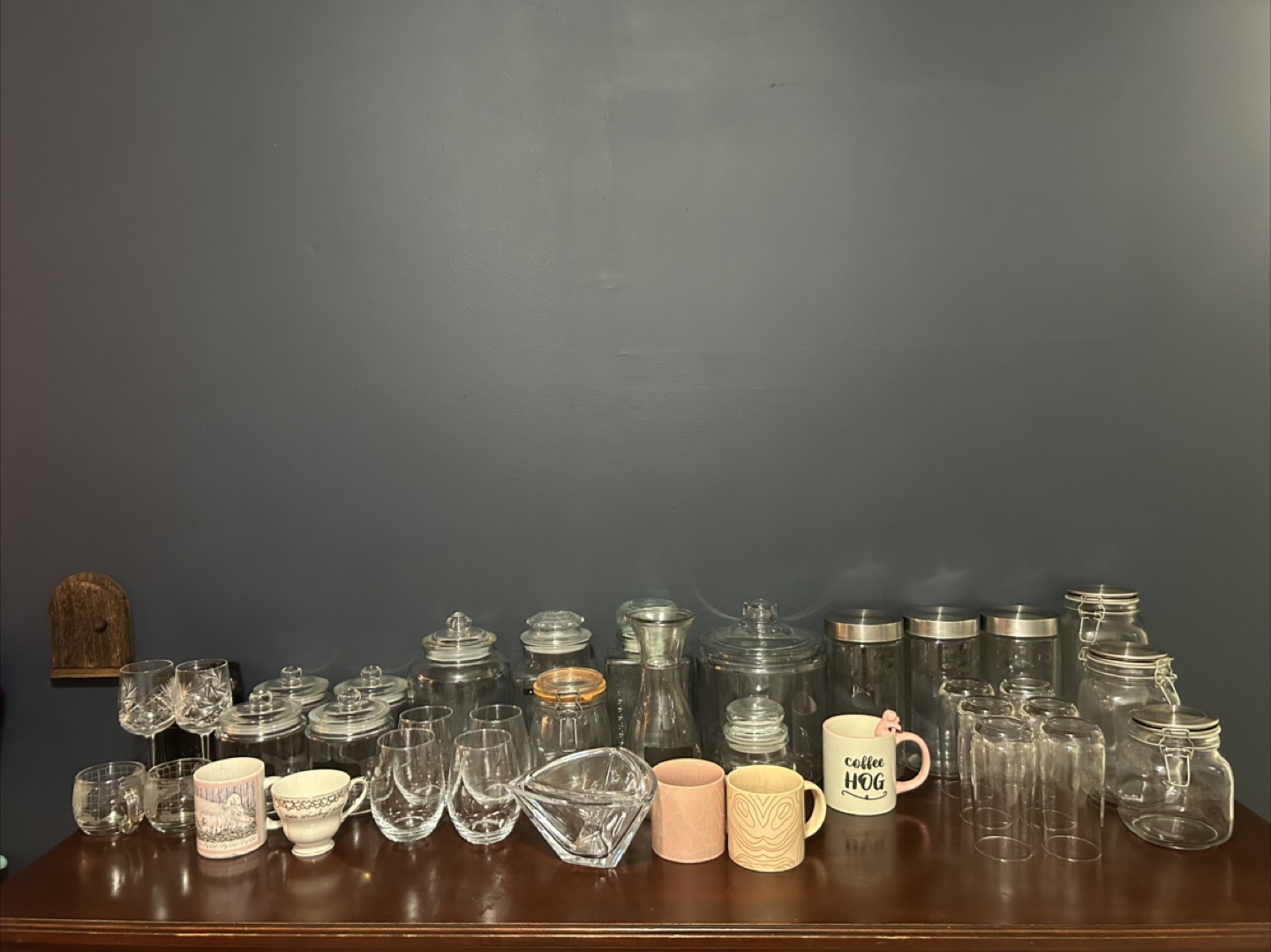Selling a variety of glassware and jars - wine glasses, mugs, and storage jars & candy dish, all of different sizes and styles.