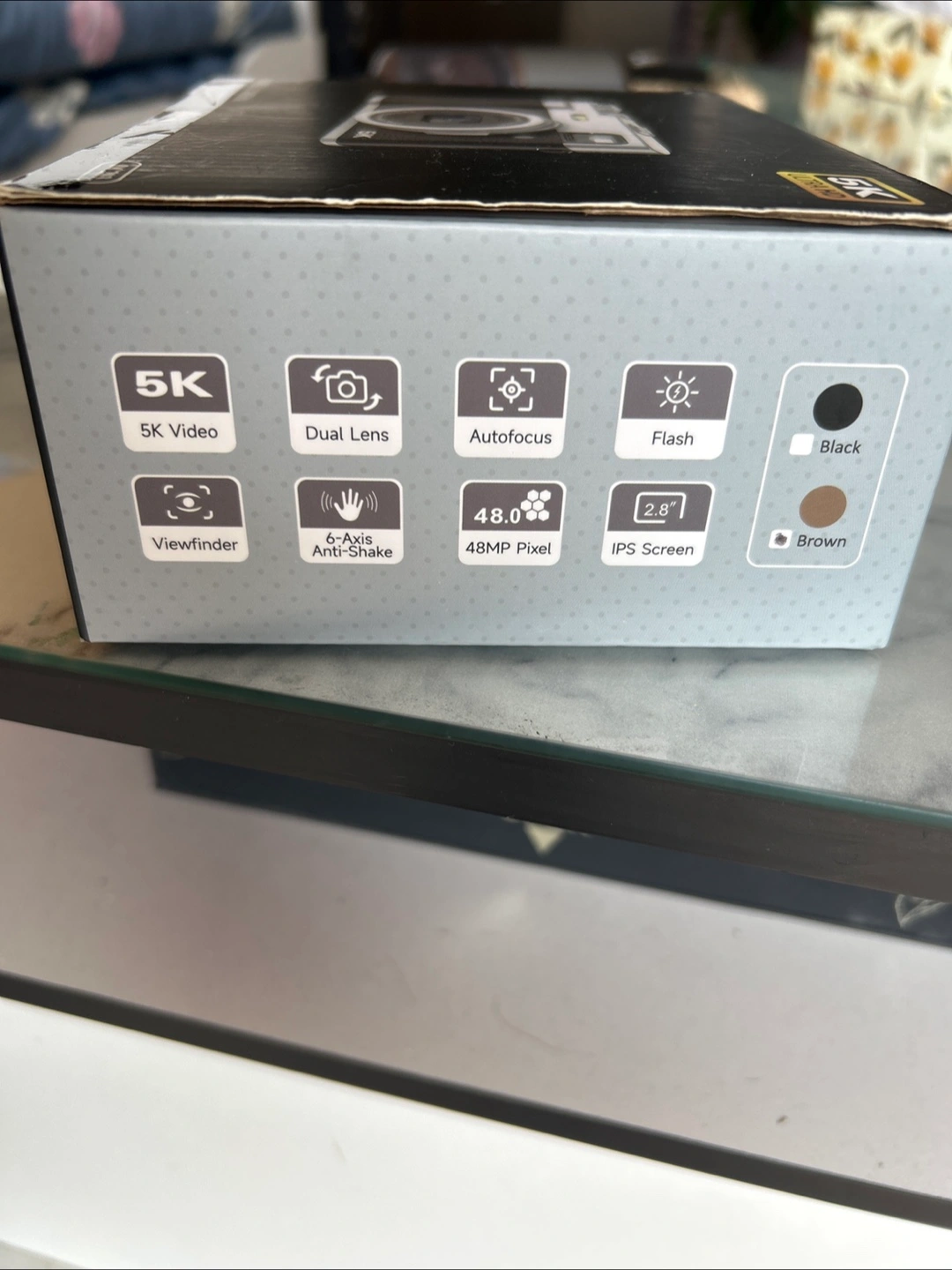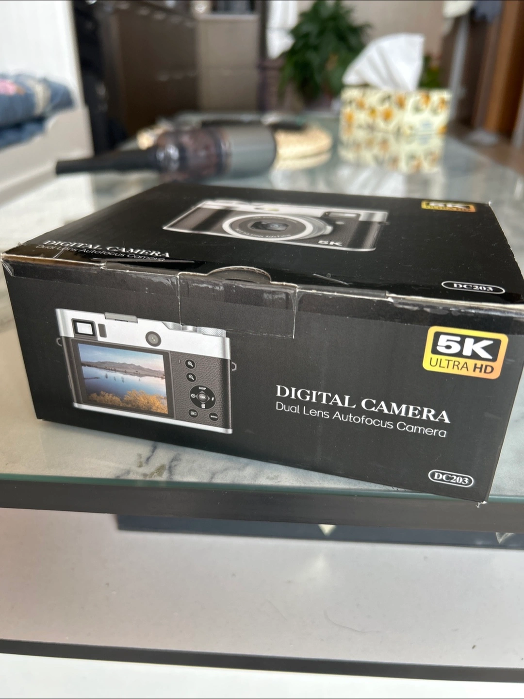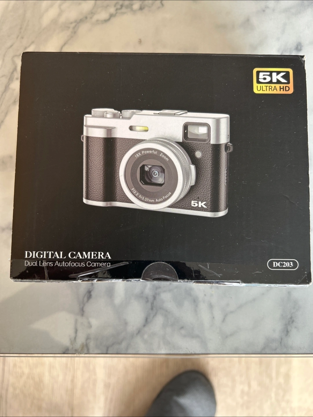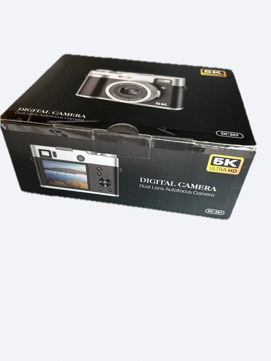 Selling a brand new DC203 digital camera in its original box! It's a dual-lens autofocus camera that shoots in 5K Ultra HD. It features: