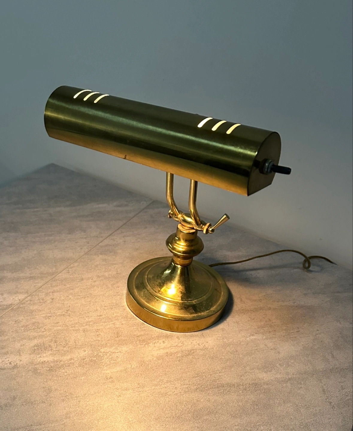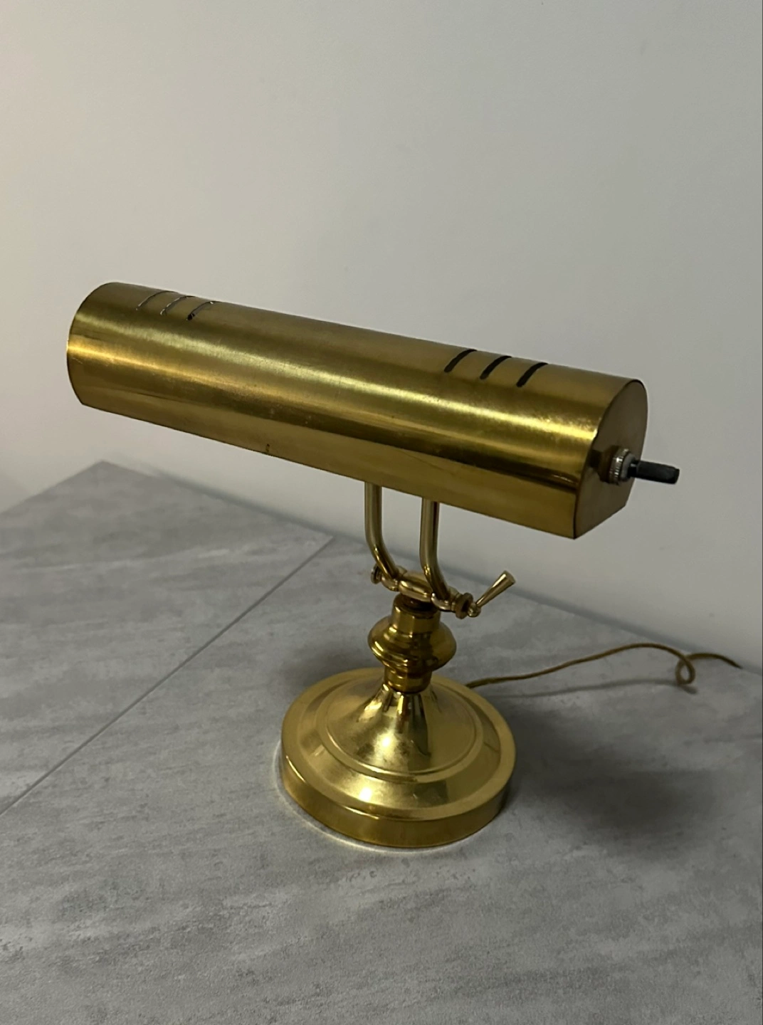 brass piano desk lamp. It's in great shape. It gives off a nice, warm light, perfect for reading or working. 10”w x 12”h x 8”L
