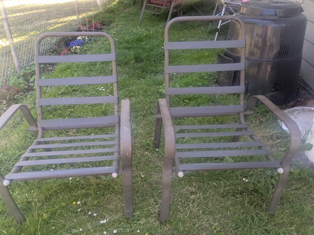 20Two lay back chairs 34 in high and 24in wide. Brown metal frame and hard plastic straps for seat and back . Does not come with cushion.
