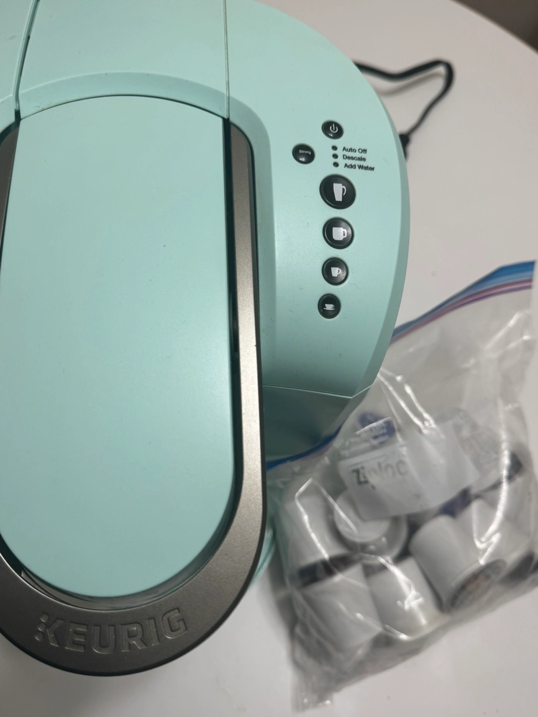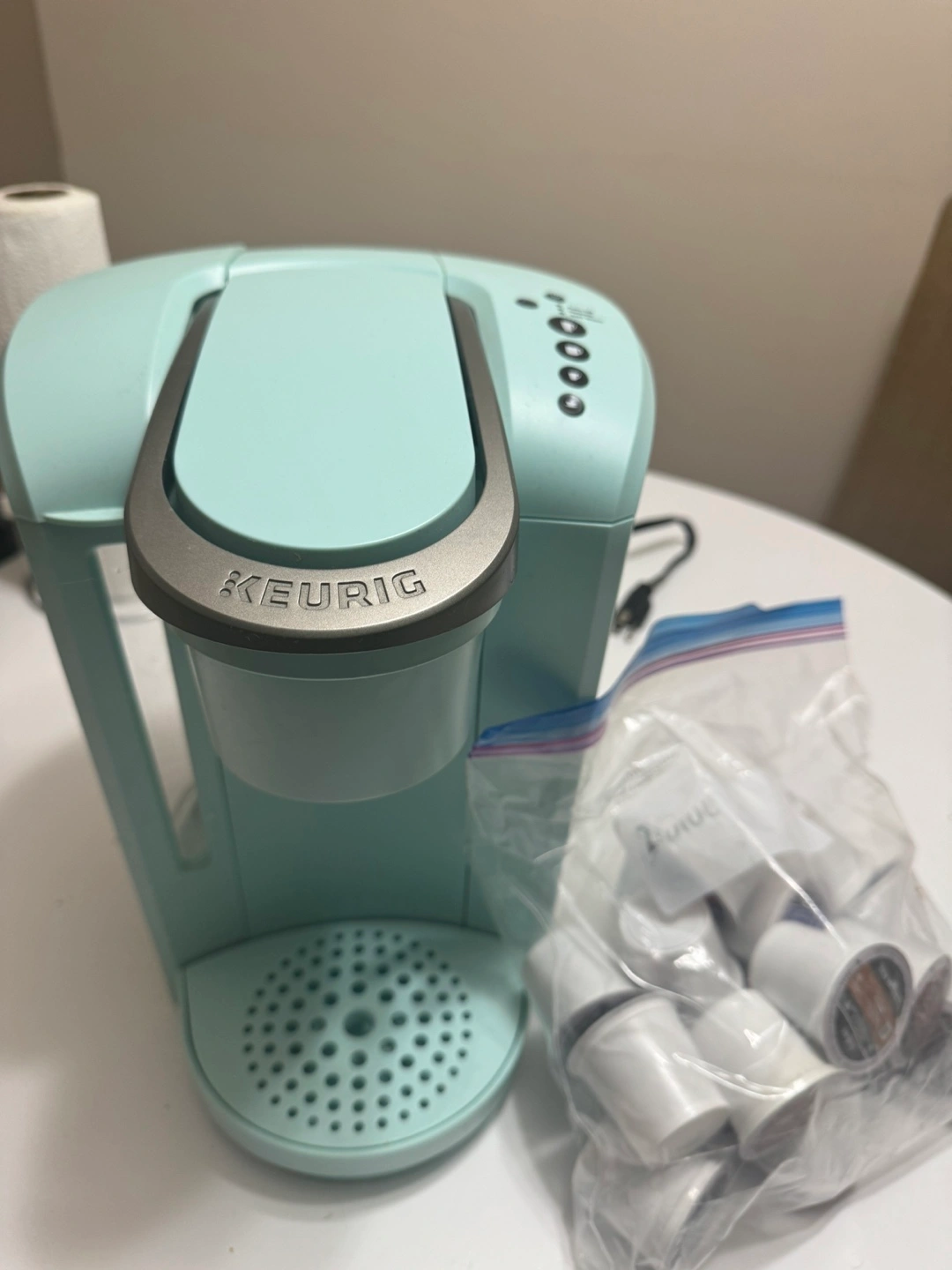 Selling a Keurig single serve coffee maker in a lovely light blue colour! It's perfect for making a quick cup of coffee in the morning. Comes with a bag of coffee pods so you can start brewing right away
