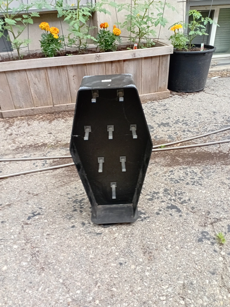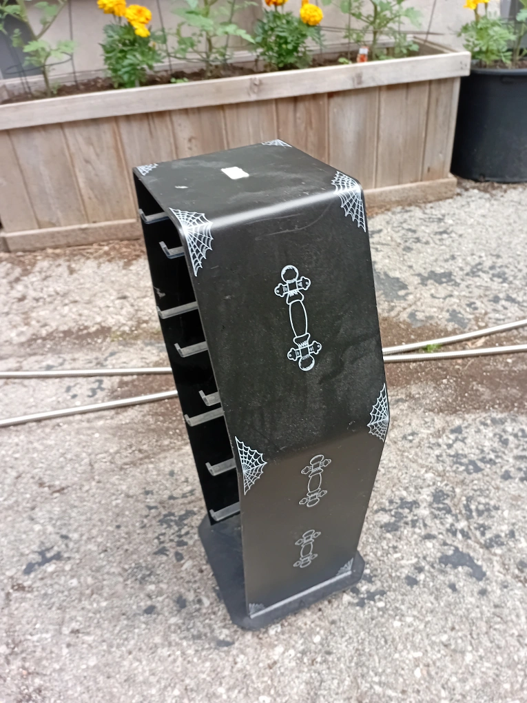 Selling a unique black coffin-shaped display! It's a fun and spooky way to organize your accessories. Perfect for Halloween or year-round for those with a gothic style. It has several spots for items such as bracelets, necklaces, hair ties and more. Freely rotates 360° in both directions. This used to be a Spirit Halloween product display - Ive never found another anywhere else. Add a touch of the macabre to your entryway or closet!