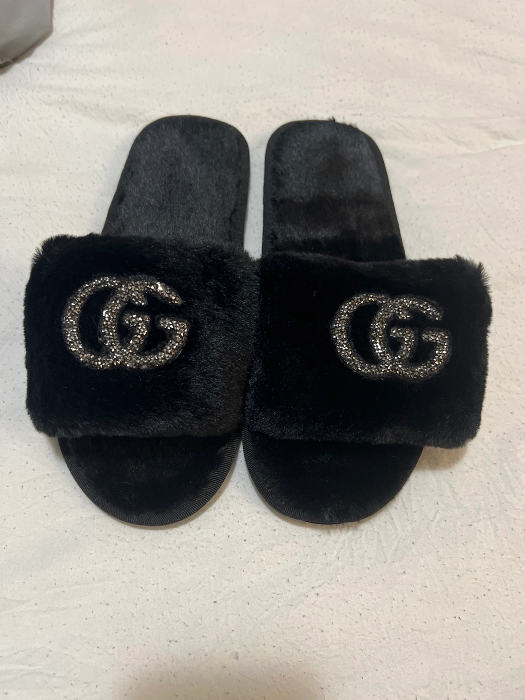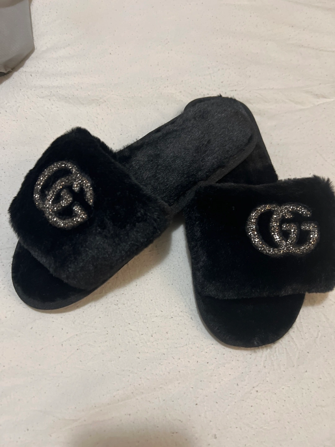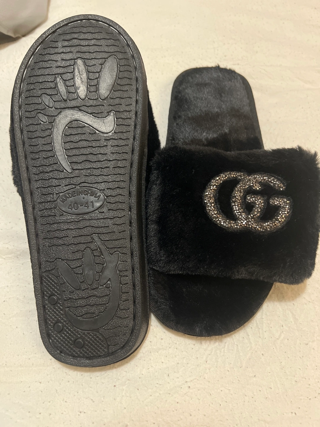 Selling a pair of furry slides in black. They're marked as size 40-41. Super comfy and stylish for wearing around the house!