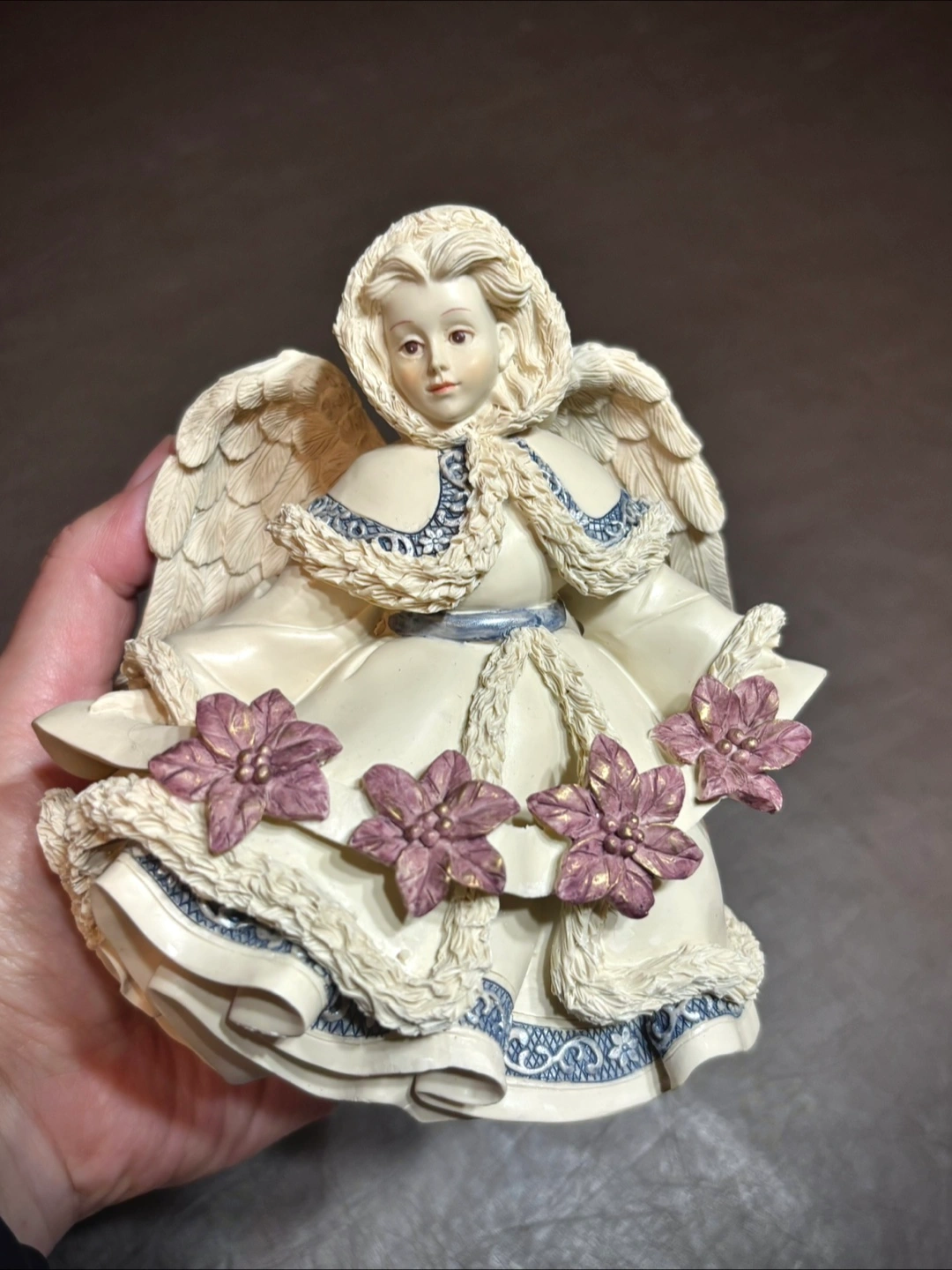 This angel is holding a ribbon with four poinsettias and is in perfect condition.