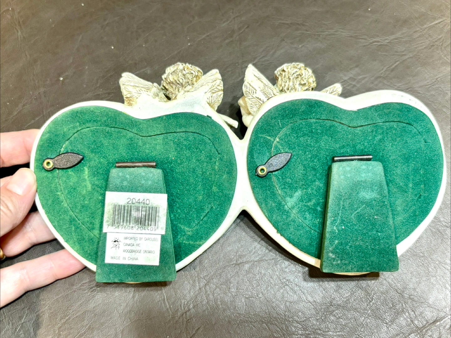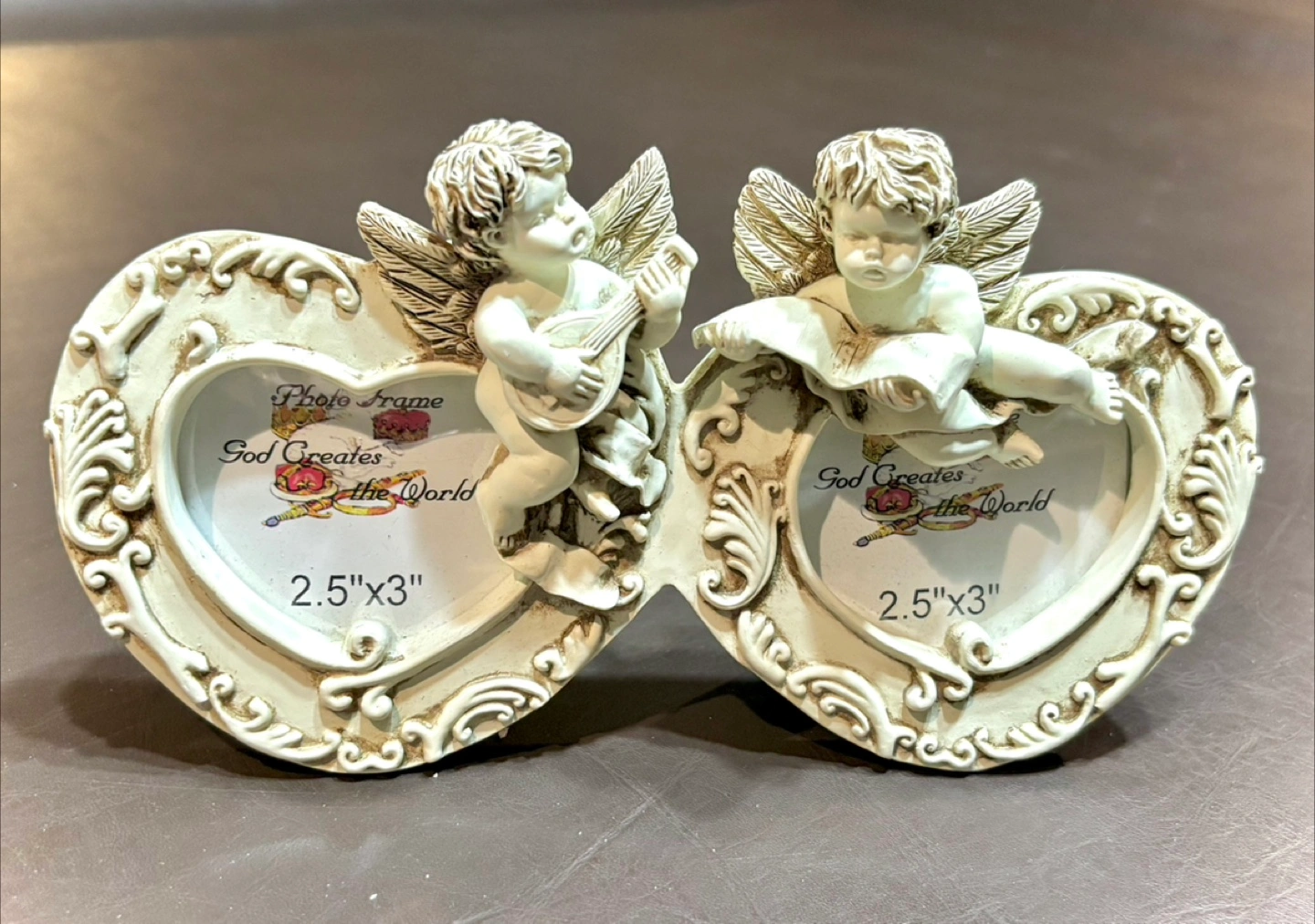 This is a charming double heart photo frame featuring angel figurines.