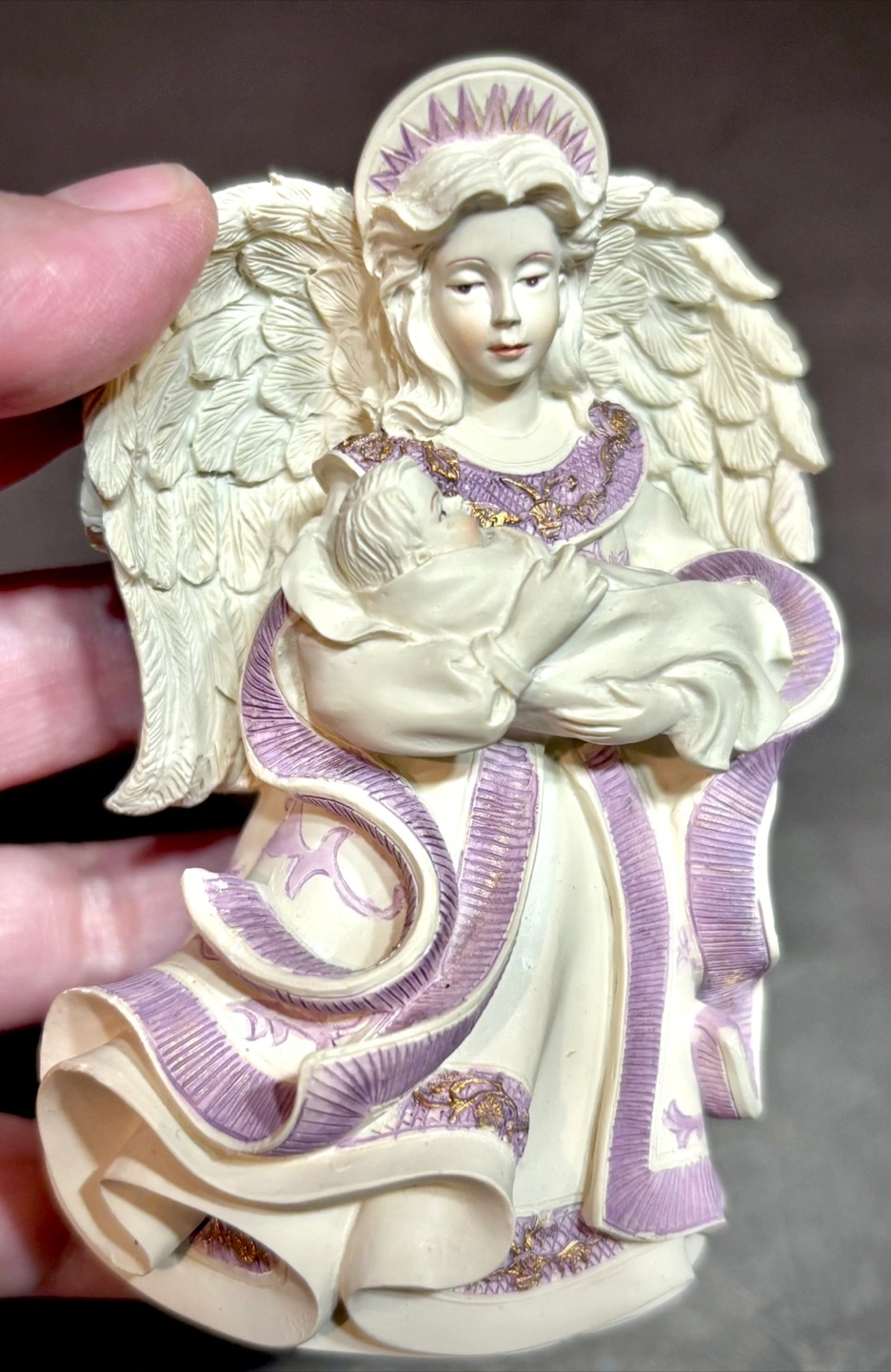 The figurine is decorated with purple and gold accents.