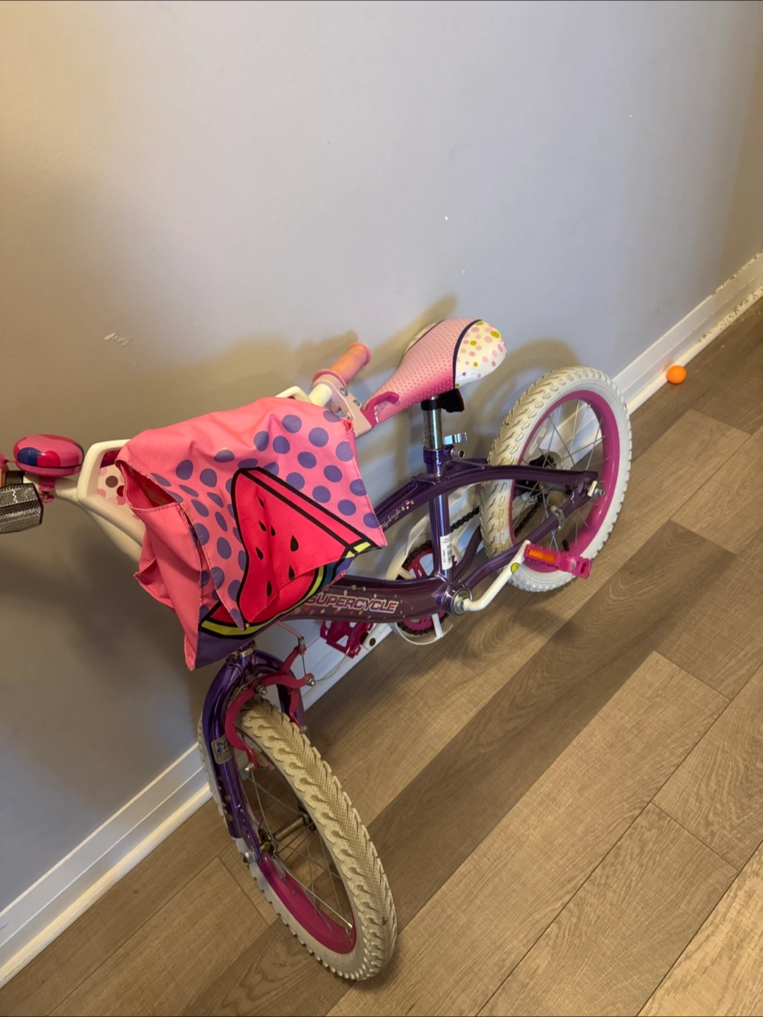 Selling a cute Supercycle kids' bike! It's purple and pink, perfect for a little one learning to ride. It has a watermelon themed bag on the front and a polka dot seat. Ready for its next adventure!