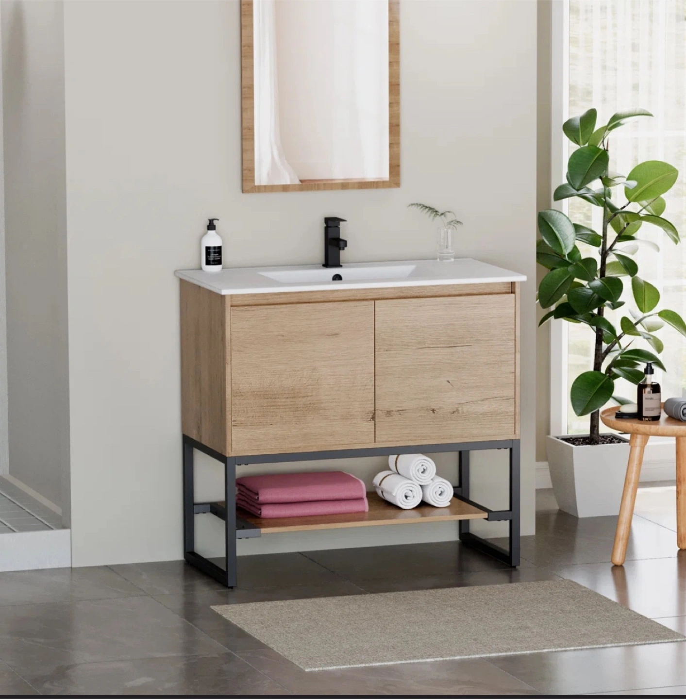 This spacious vanity cabinet offers lots of storage with its dual soft-close doors and open shelf for convenient access. It features a natural wood grain finish and build-in handles. The anti-rustic metal frame and protective plastic leg levelers add to its durability and style. Sink is not included. Only vanity cabinet