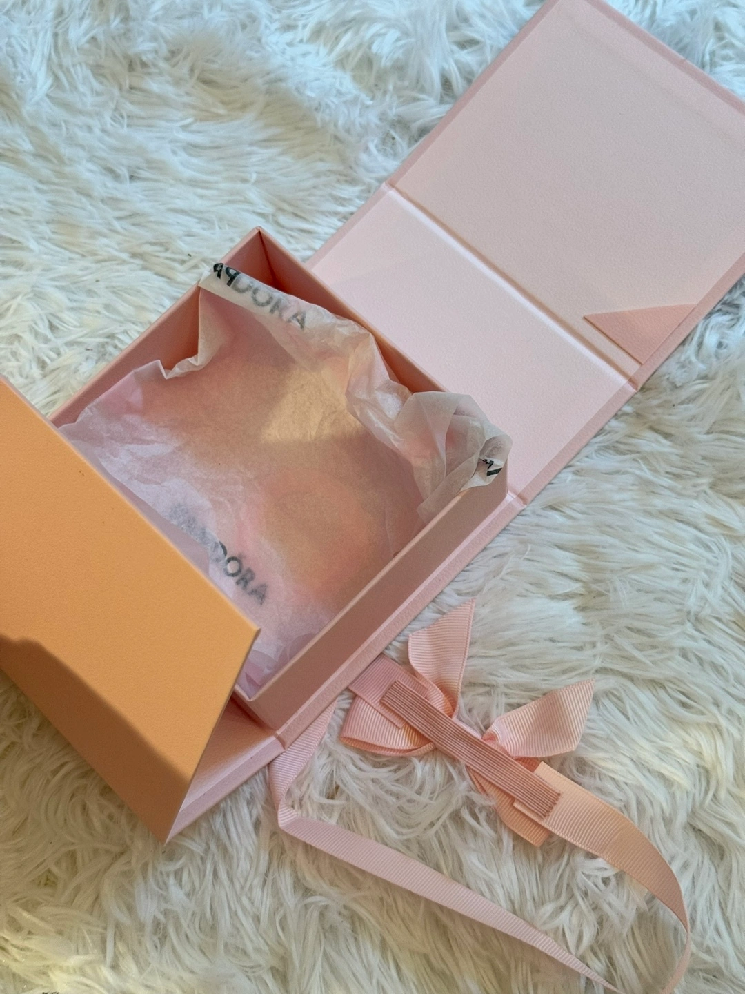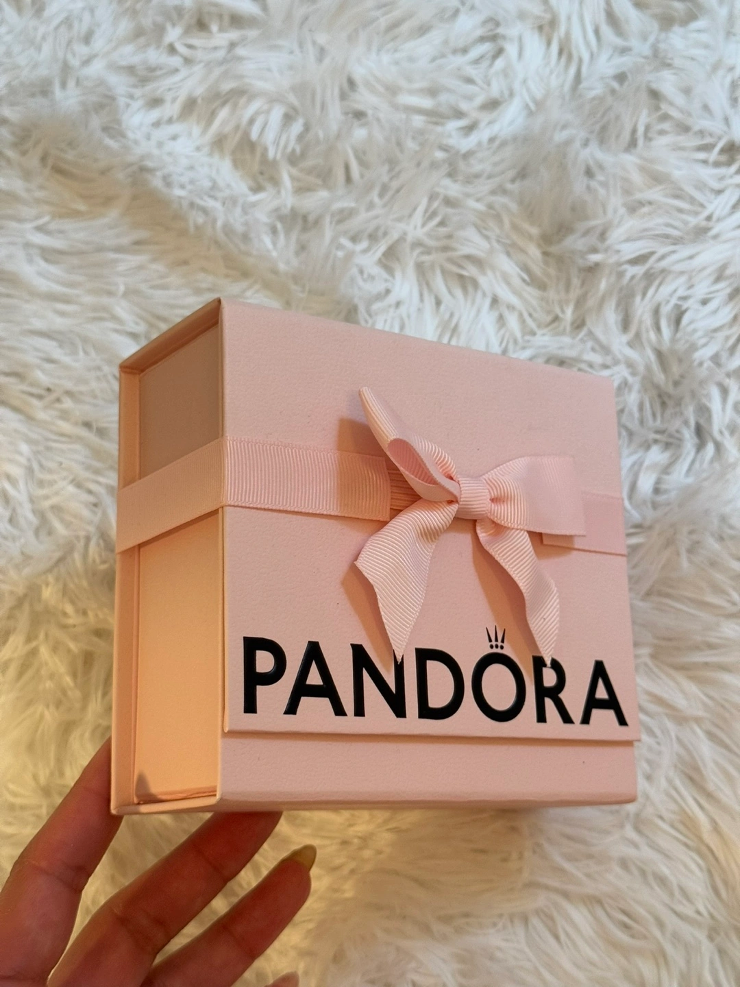 Pandora jewelry box in a lovely light pink color! It's perfect for storing your favorite Pandora charms and bracelets. The box includes a ribbon and has a soft, padded interior to keep your jewelry safe and scratch-free