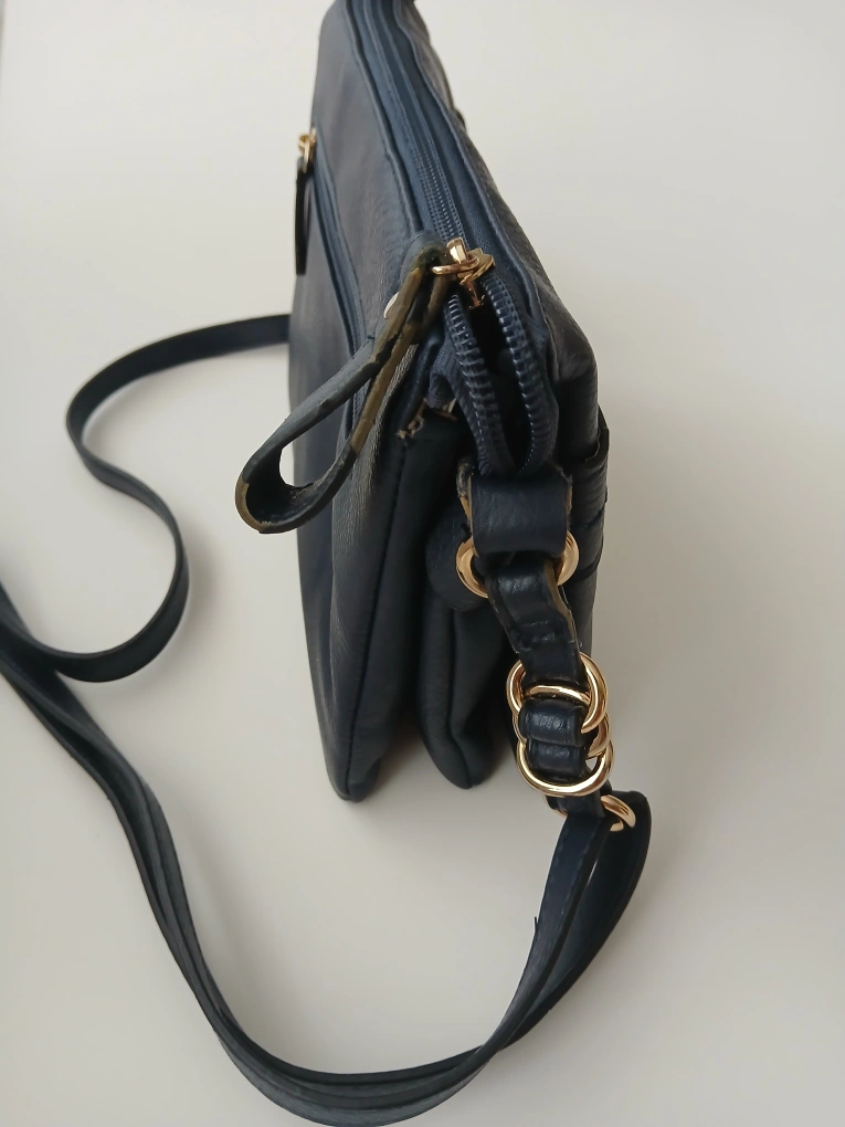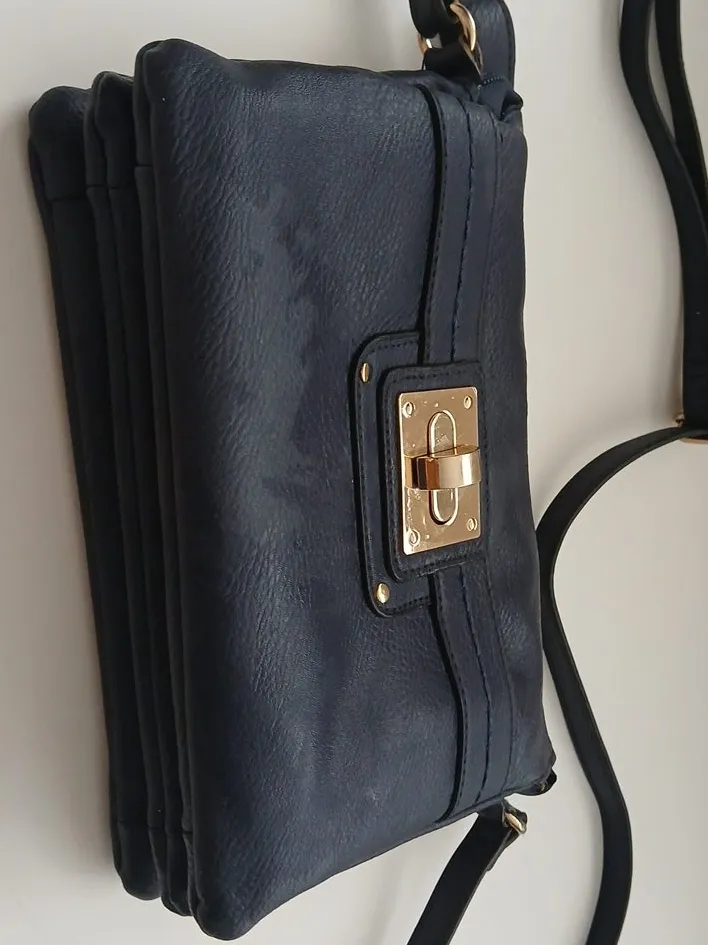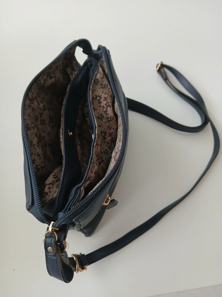 A cute navy blue crossbody bag with gold-tone hardware. It's in great condition and perfect for carrying your essentials on the go! It features a turn-lock closure and a zippered compartment for added security.