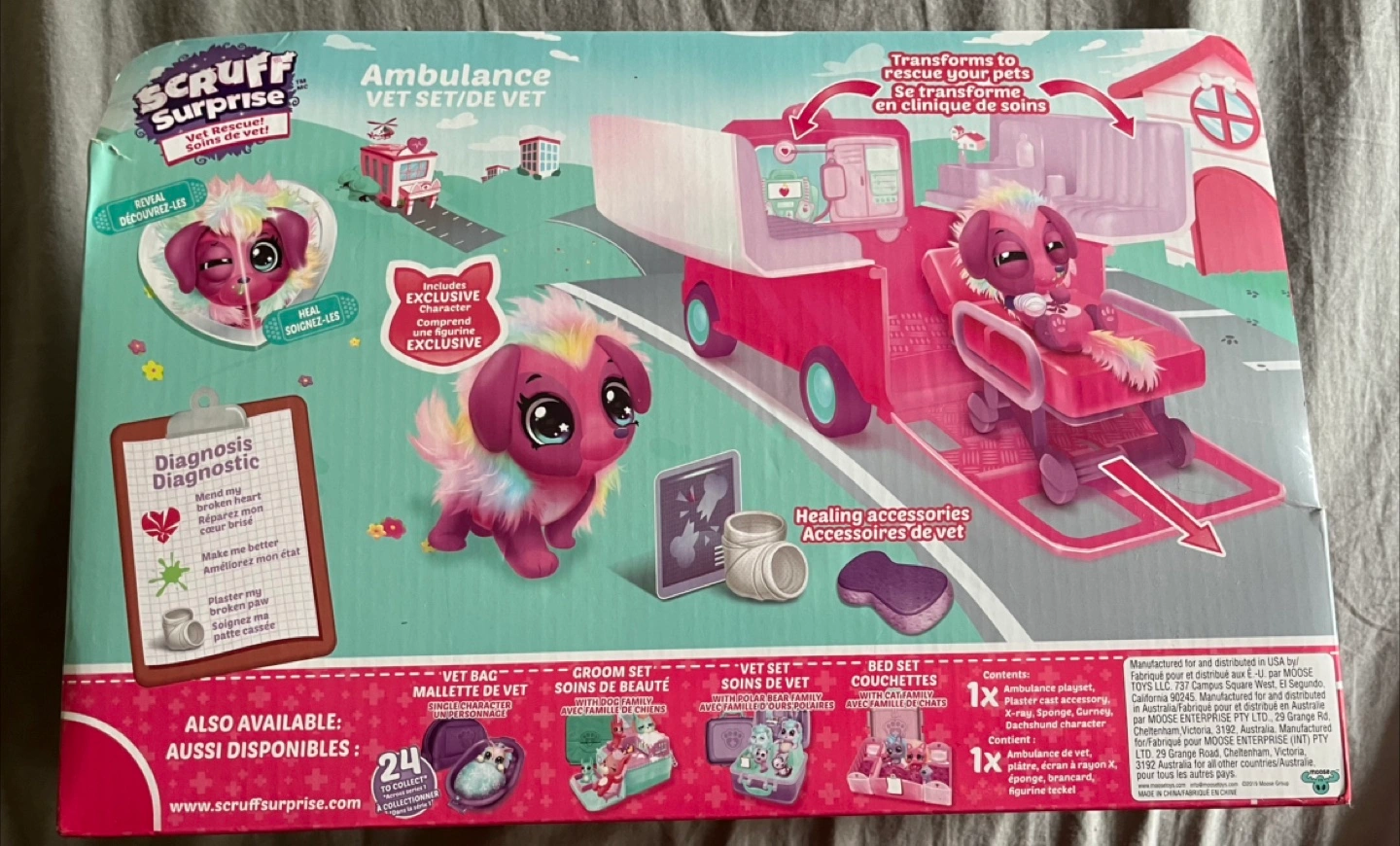 15Selling a Scruff Surprise Vet Set/De Vet Ambulance! This cute set includes everything your little one needs to rescue and heal their Scruff-a-Luvs pets. It transforms to rescue your pets. Includes healing accessories. Perfect for kids aged 5+