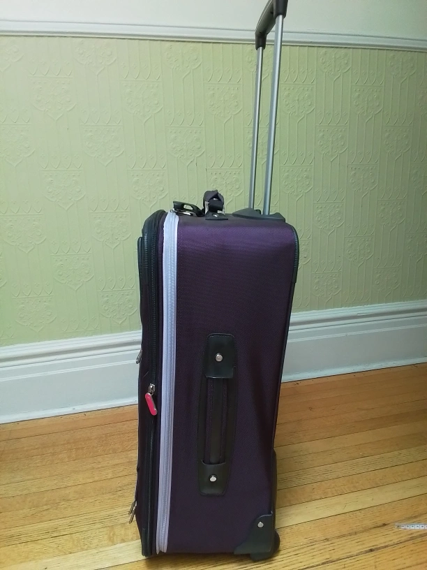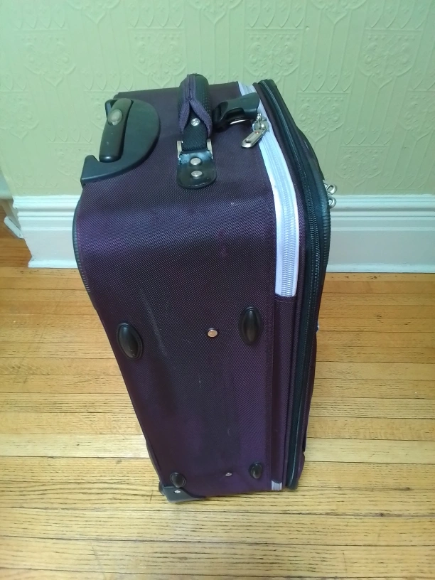 Here's a gently used Swiss Gear rolling suitcase in great shape! It's a convenient size for travelling, but not carry-on size. LxWxH = 17"x9"x26.5". The suitcase has a telescoping handle and smooth-rolling wheels, making it easy to navigate through airports. It also has a couple of exterior pockets for easy access to travel documents or other essentials and separate straps to secure personal item or purse.