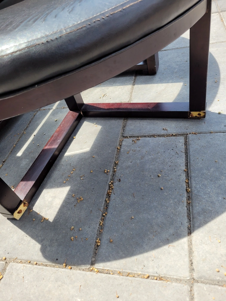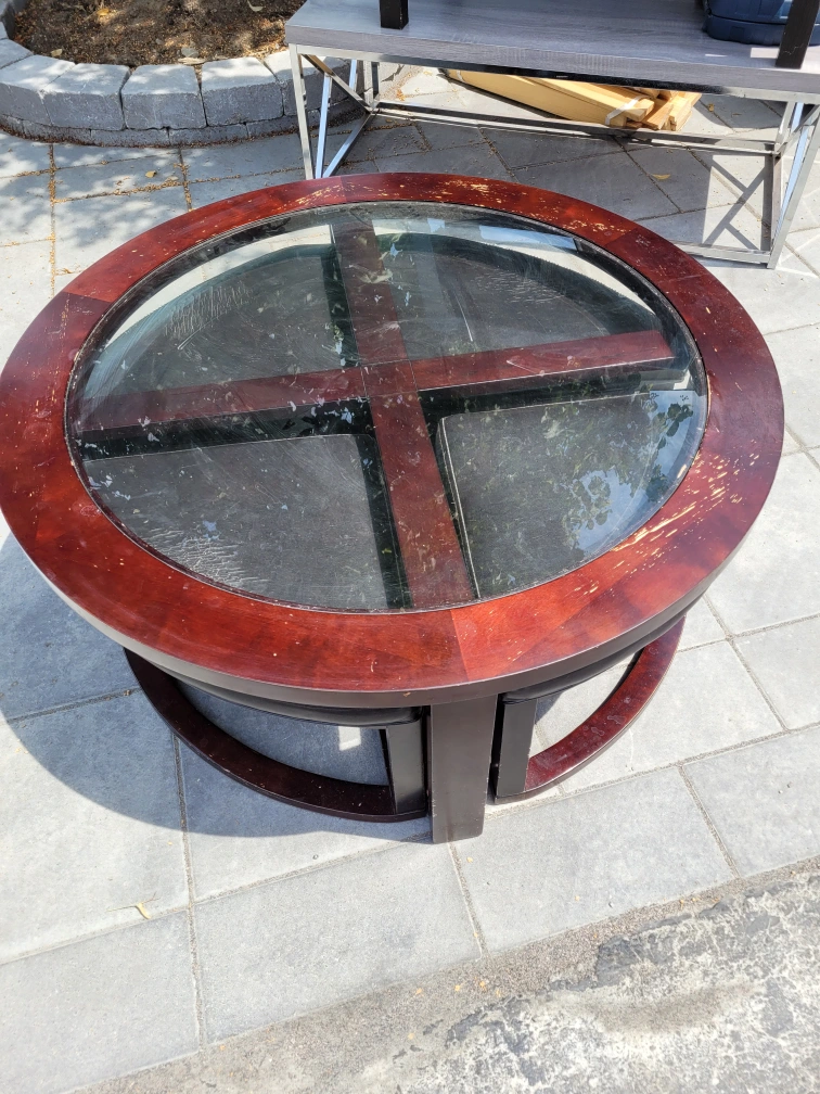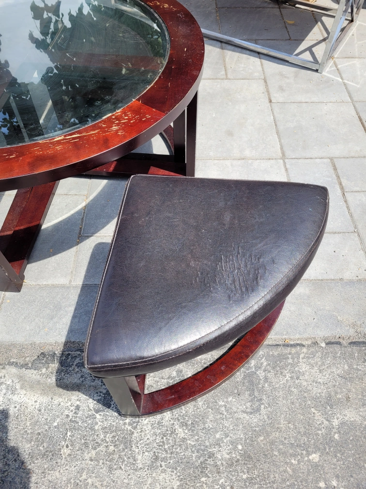 Selling a round glass coffee table with a matching ottoman. The table has a dark wood frame and a glass top. The ottoman is upholstered in a dark brown material and has a unique triangular shape. There are some signs of wear on both the table and the ottoman, but they are still in good usable condition. One of the ottoman wood frame is broken