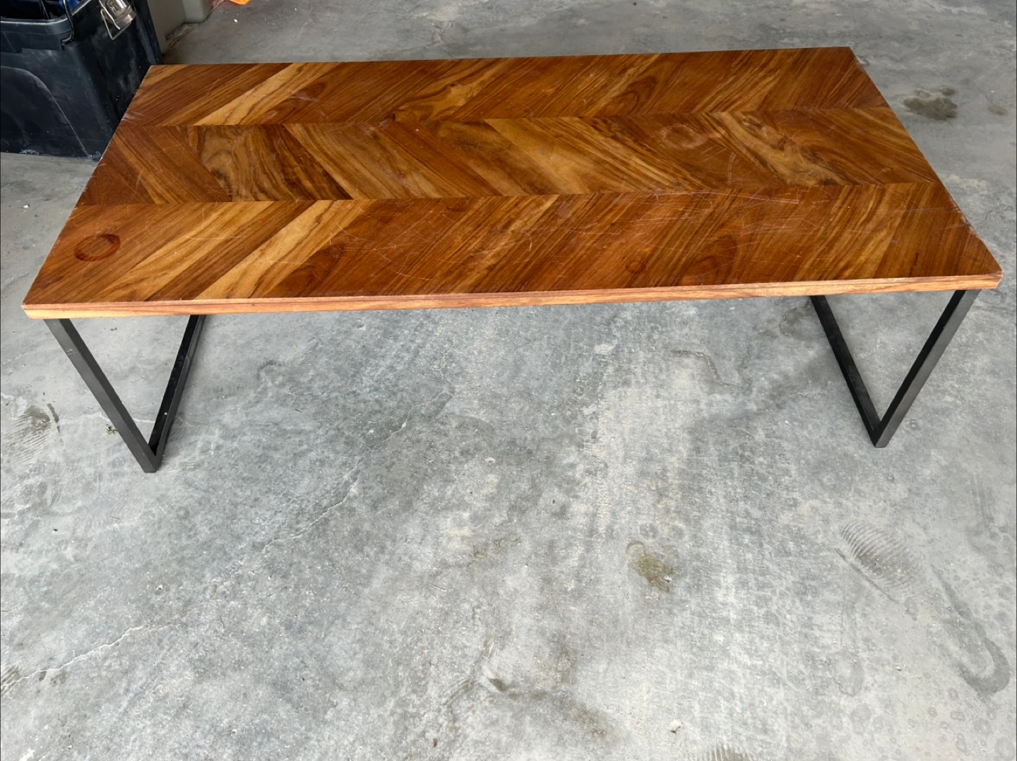 Selling a wood coffee table with a herringbone pattern on top and sturdy metal legs. It has some marks on the surface but could be refinished to your liking.