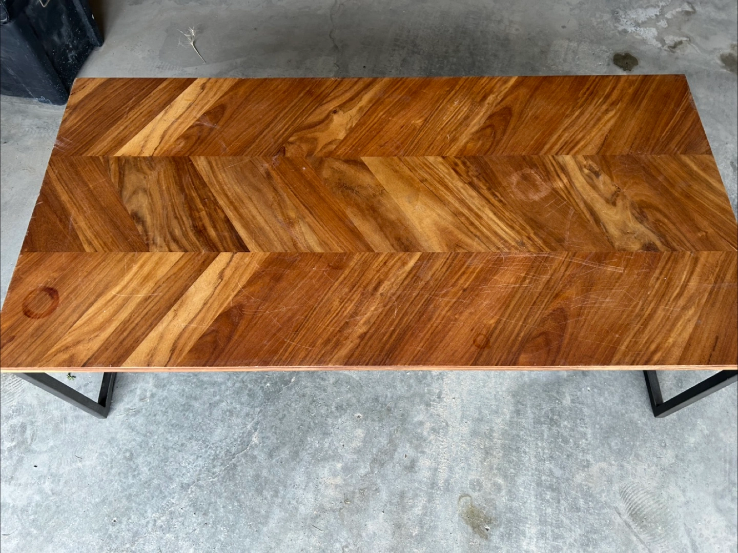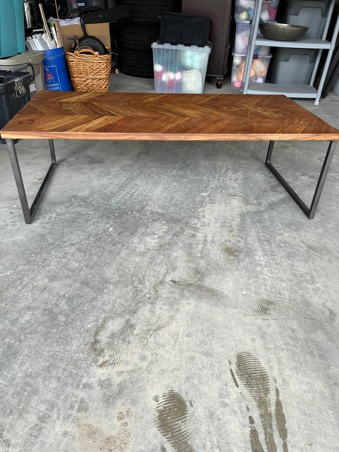 Selling a wood coffee table with a herringbone pattern on top and sturdy metal legs. It has some marks on the surface but could be refinished to your liking.