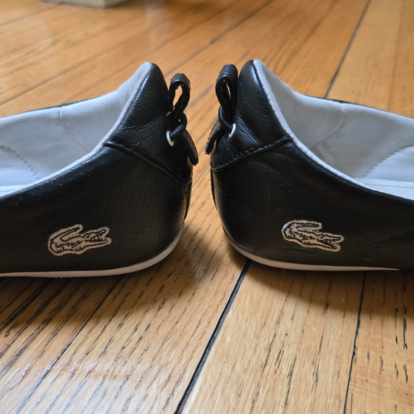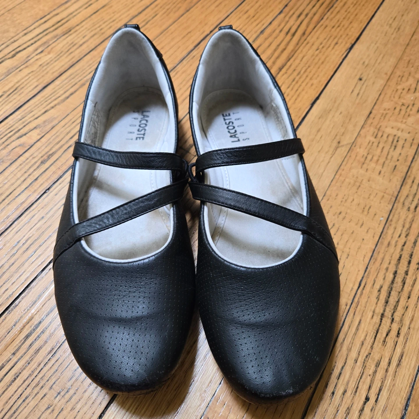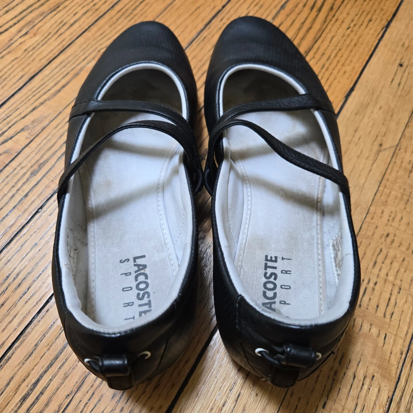 These are a pair of Lacoste Sport ballet flats in black. They have a sporty look and would be great for everyday wear. There are some signs of wear on the soles, but the shoes are in good condition overall!