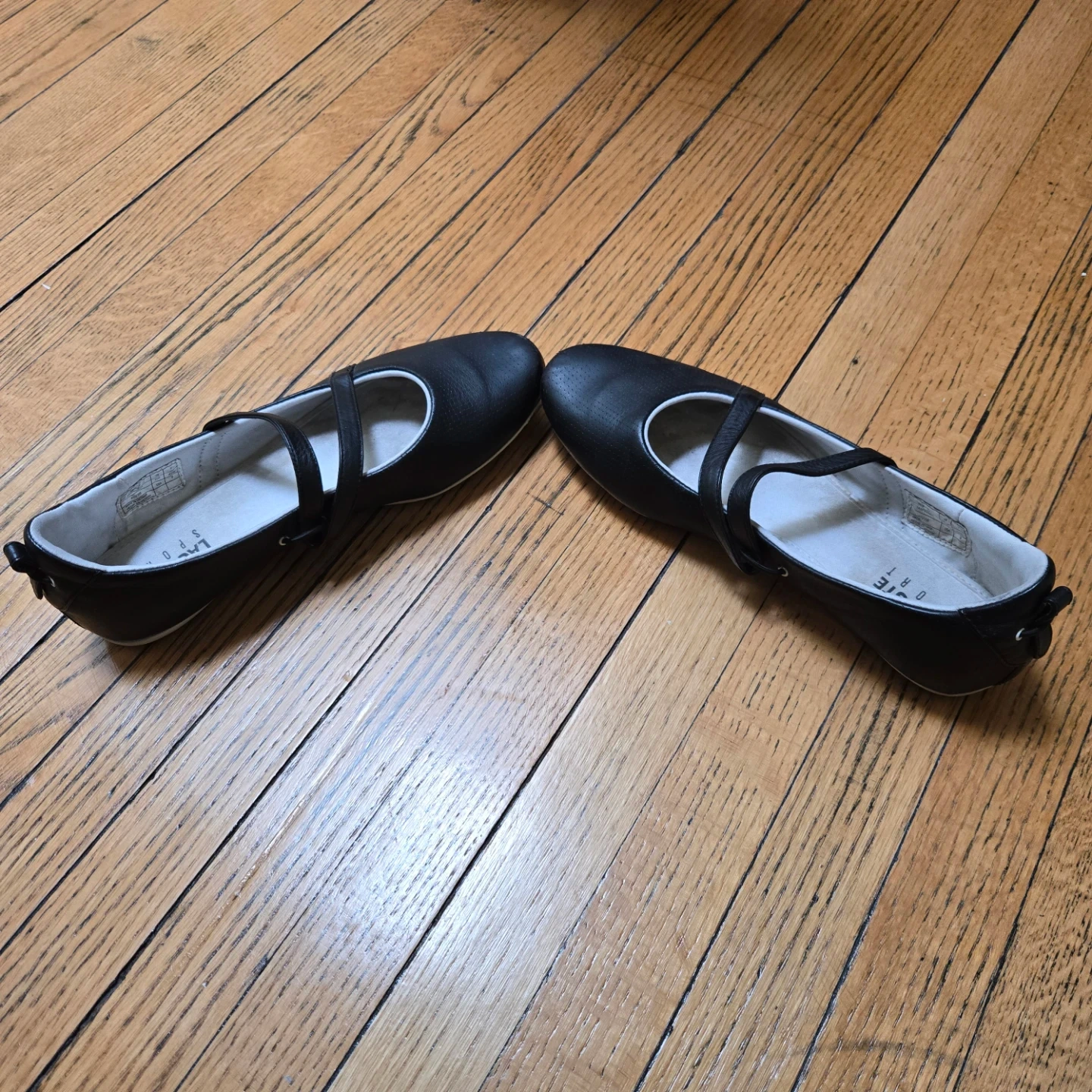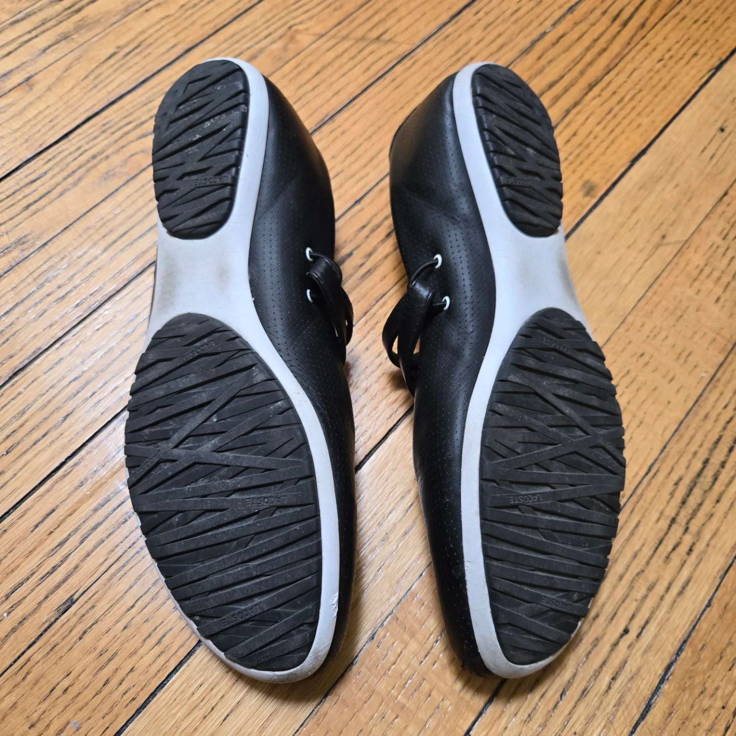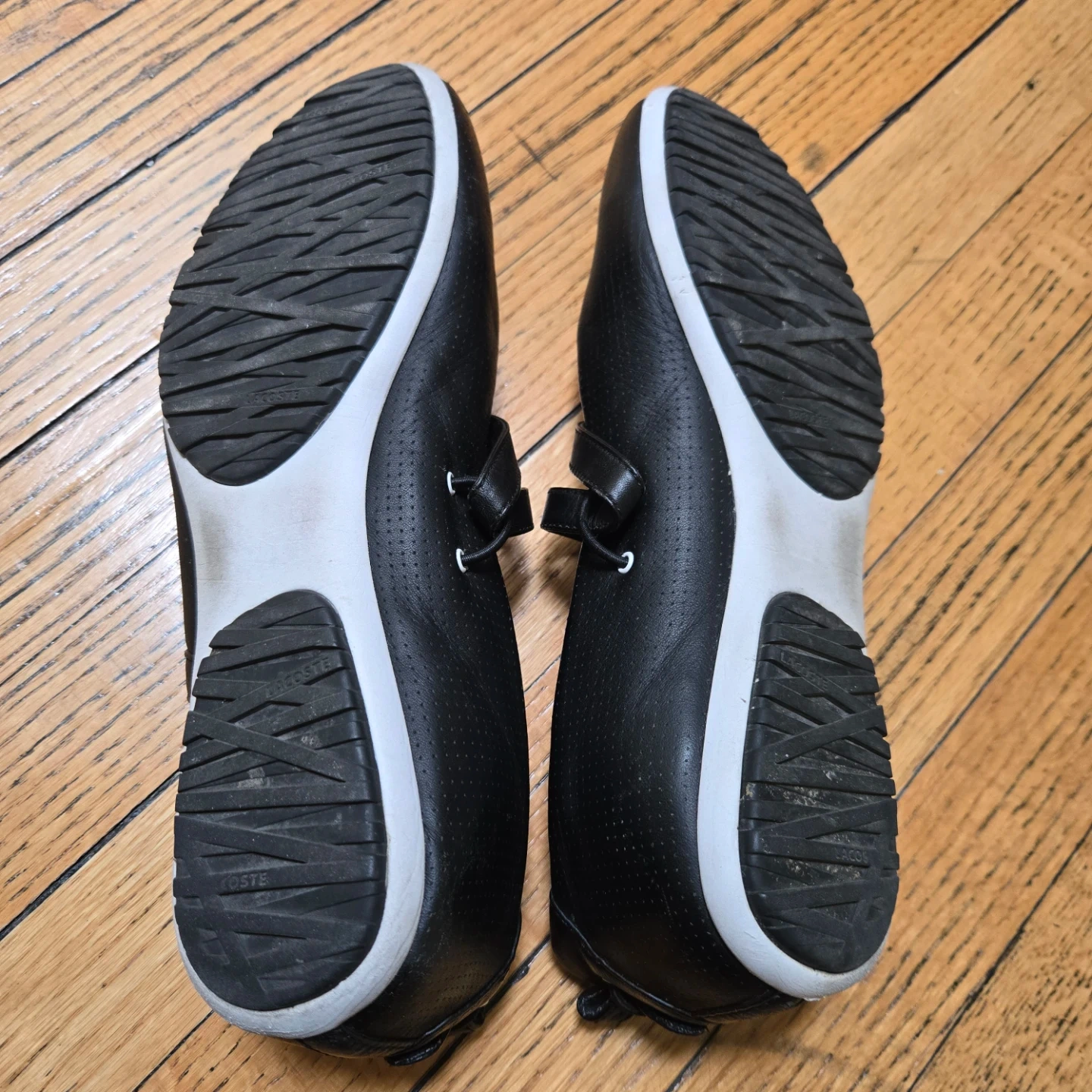 These are a pair of Lacoste Sport ballet flats in black. They have a sporty look and would be great for everyday wear. There are some signs of wear on the soles, but the shoes are in good condition overall!