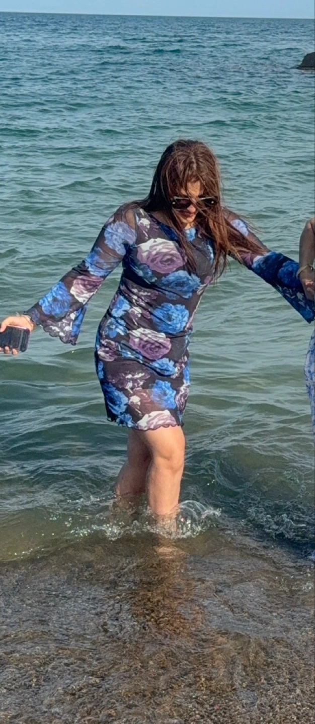 This is a dress with a floral print featuring blue and purple roses. It has long sleeves and a fitted silhouette. It appears to be made of a lightweight, possibly sheer material Wore 1 time