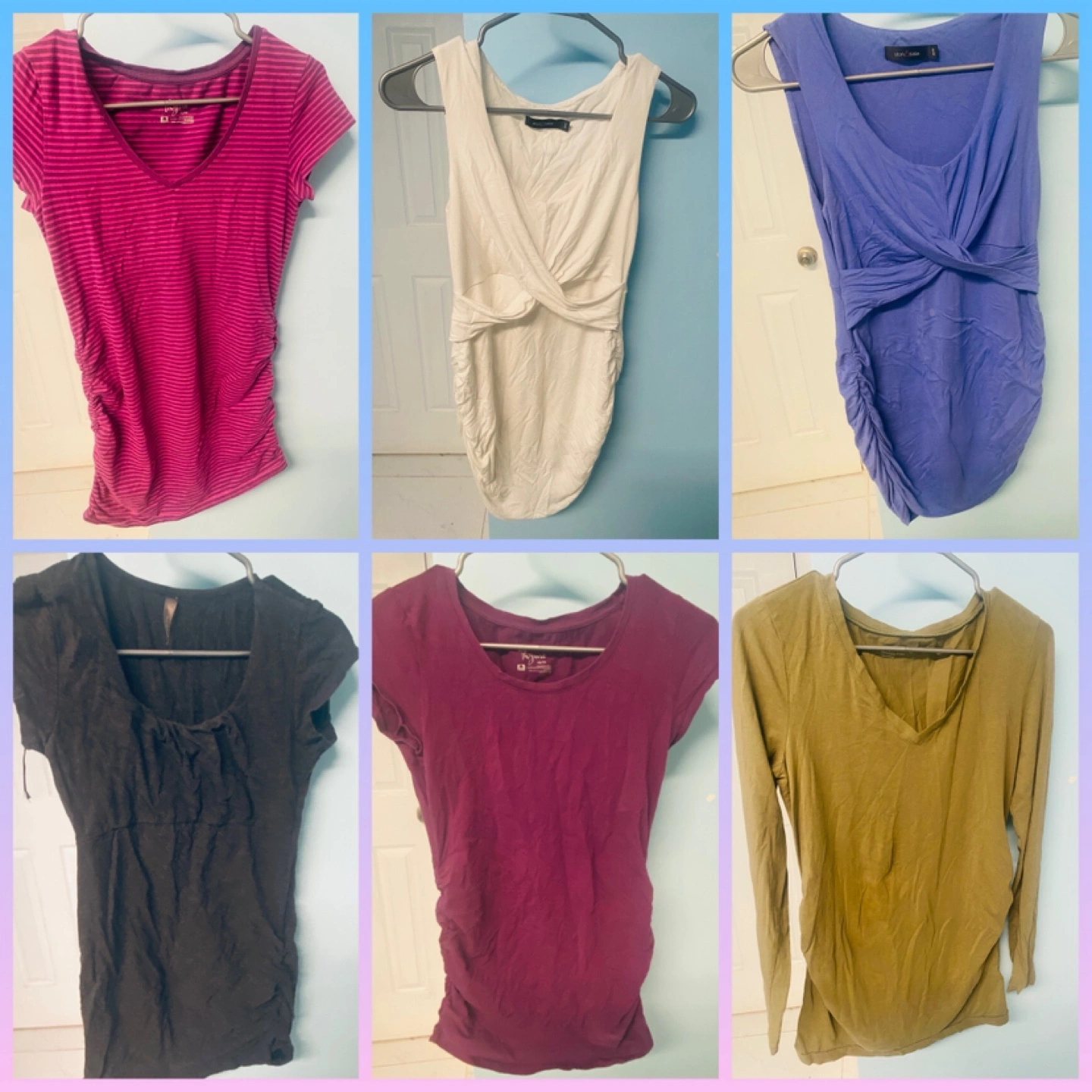 Selling a bundle of maternity tops in various colours and styles. Brands include Stork & Babe and Thyme. Comfortable and in great condition for your pregnancy journey!