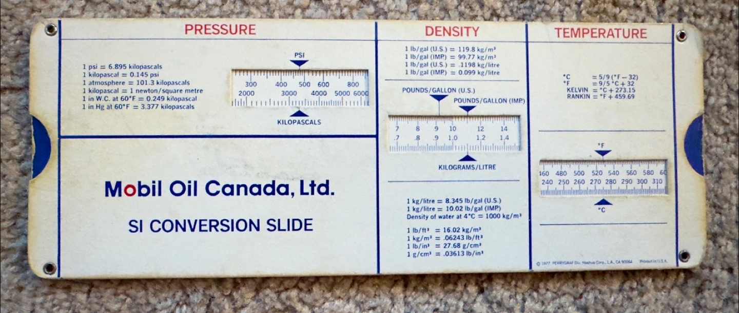 Here's a vintage Mobil Oil Canada SI Conversion Slide! It features various unit conversions for length, area, volume, mass/weight, pressure, density, and temperature. A cool piece for any collector or engineer!
