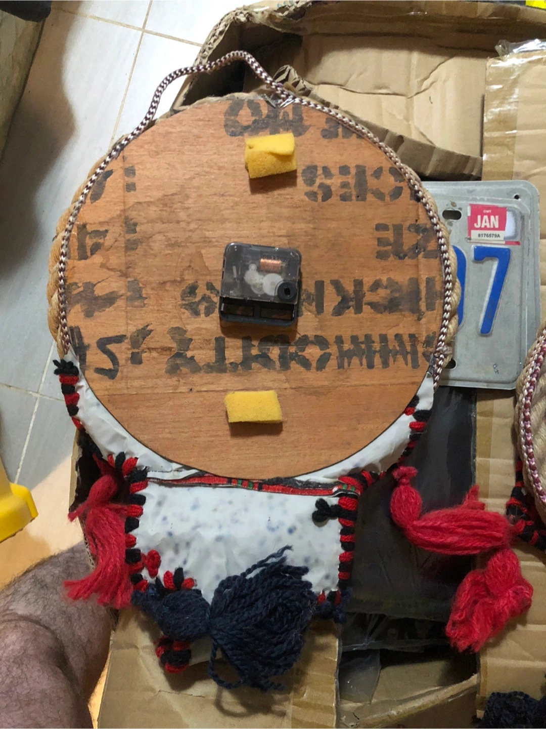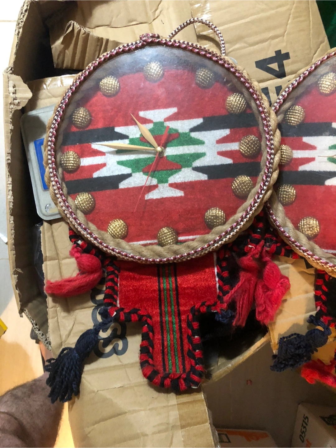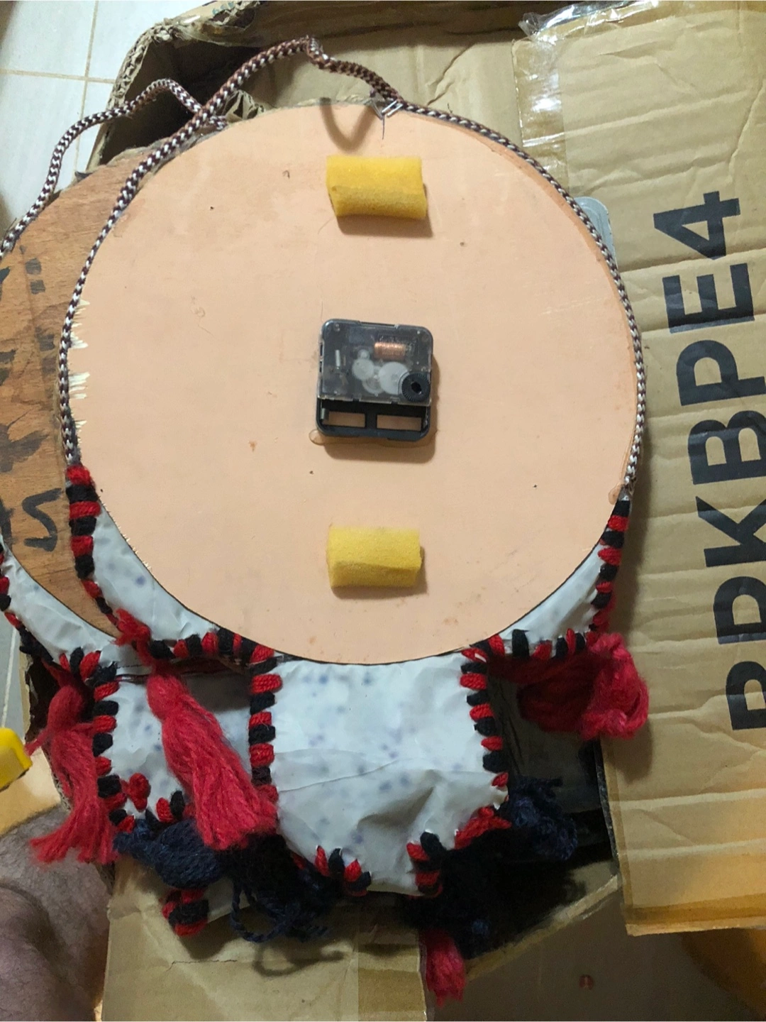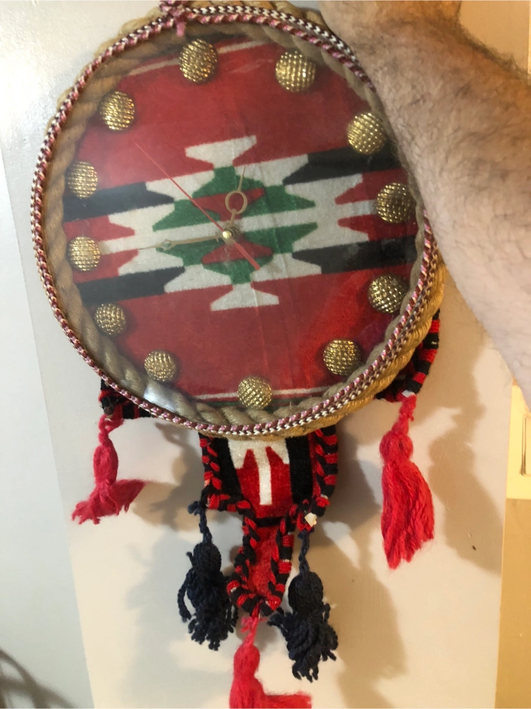 78Selling a unique, vintage-style wall clock. It has a distinctive design with red, white, and green patterns. The clock is decorated with small gold-coloured balls around the perimeter and features decorative tassels at the bottom. It's a great piece to add some character to any room!