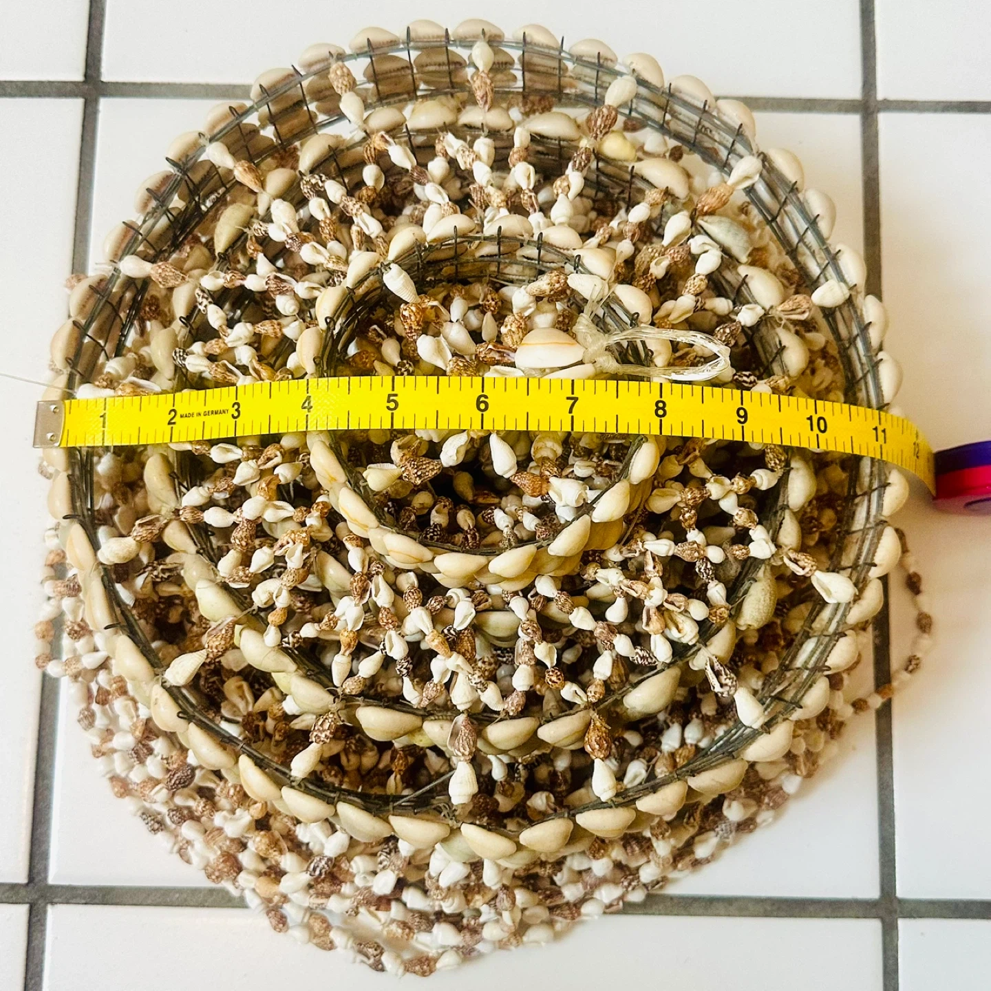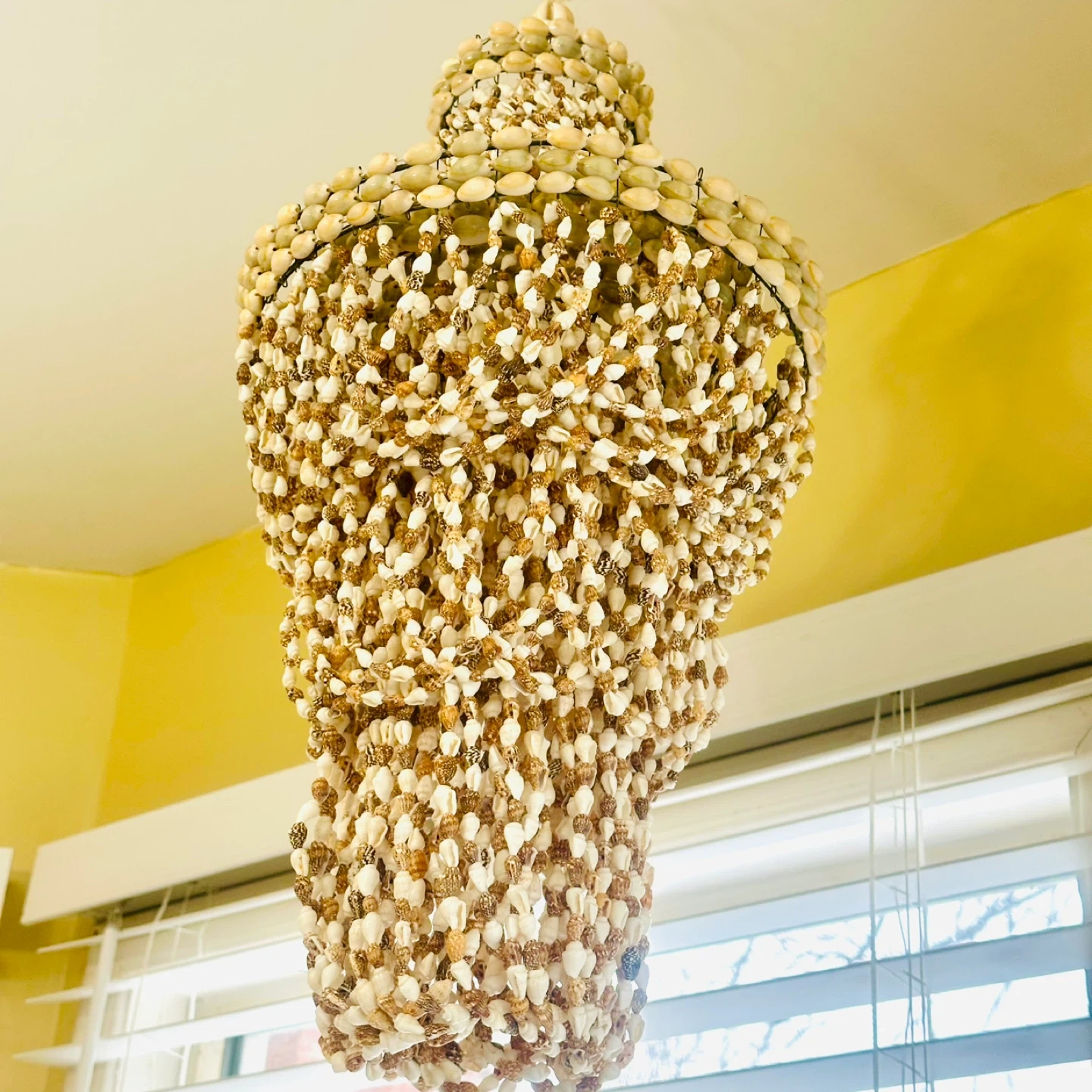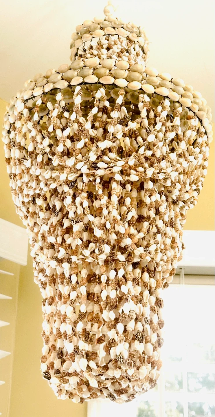 A unique seashell chandelier, perfect for adding a coastal vibe to any room. It's adorned with numerous small shells of varying colours and patterns, creating a textured and eye-catching piece. This decorative fixture would be a lovely addition to a beach-themed or eclectic home decor scheme.