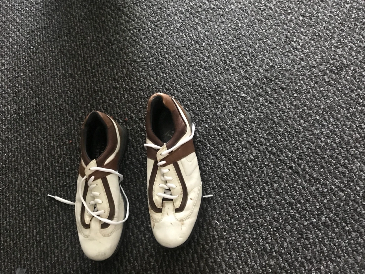 Selling a pair of golf shoes in white and brown. They show some signs of wear, as you can see in the photos, but still have lots of life left in them for the golf course