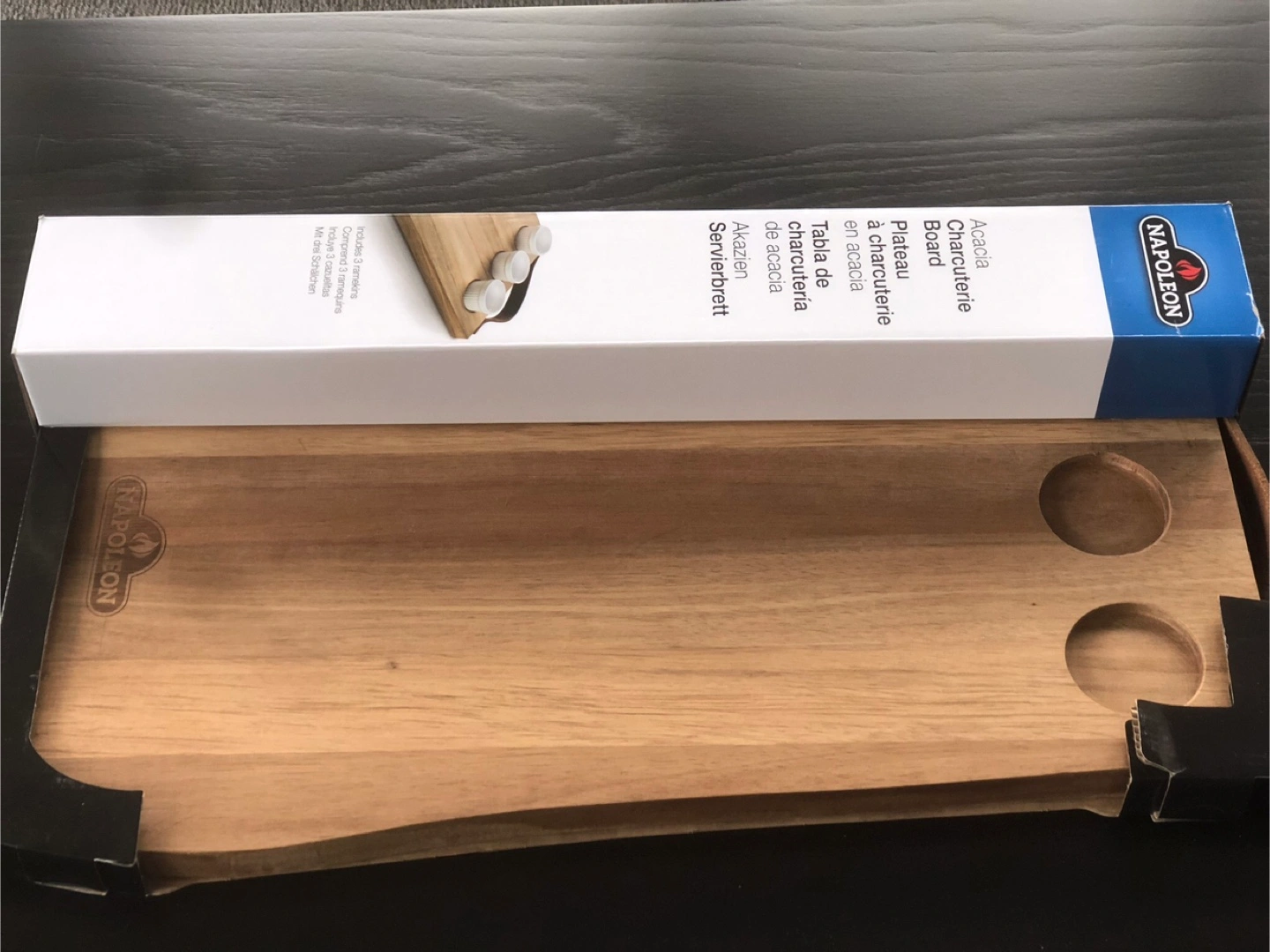 Selling a brand new Napoleon Acacia Charcuterie Board, still in its original box! It's perfect for serving up your favourite cheeses, meats, and snacks. The board includes 3 ramekins, so you can easily add dips and spreads. It's a beautiful piece for entertaining or just adding a touch of elegance to your kitchen