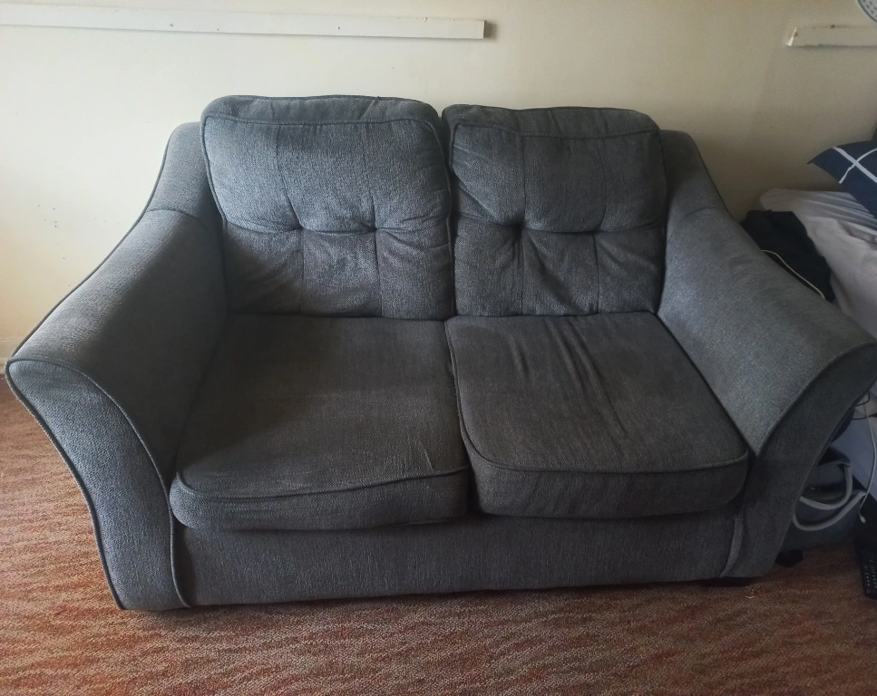 Selling a grey loveseat sofa. It's in good condition and would be perfect for a smaller space or apartment.