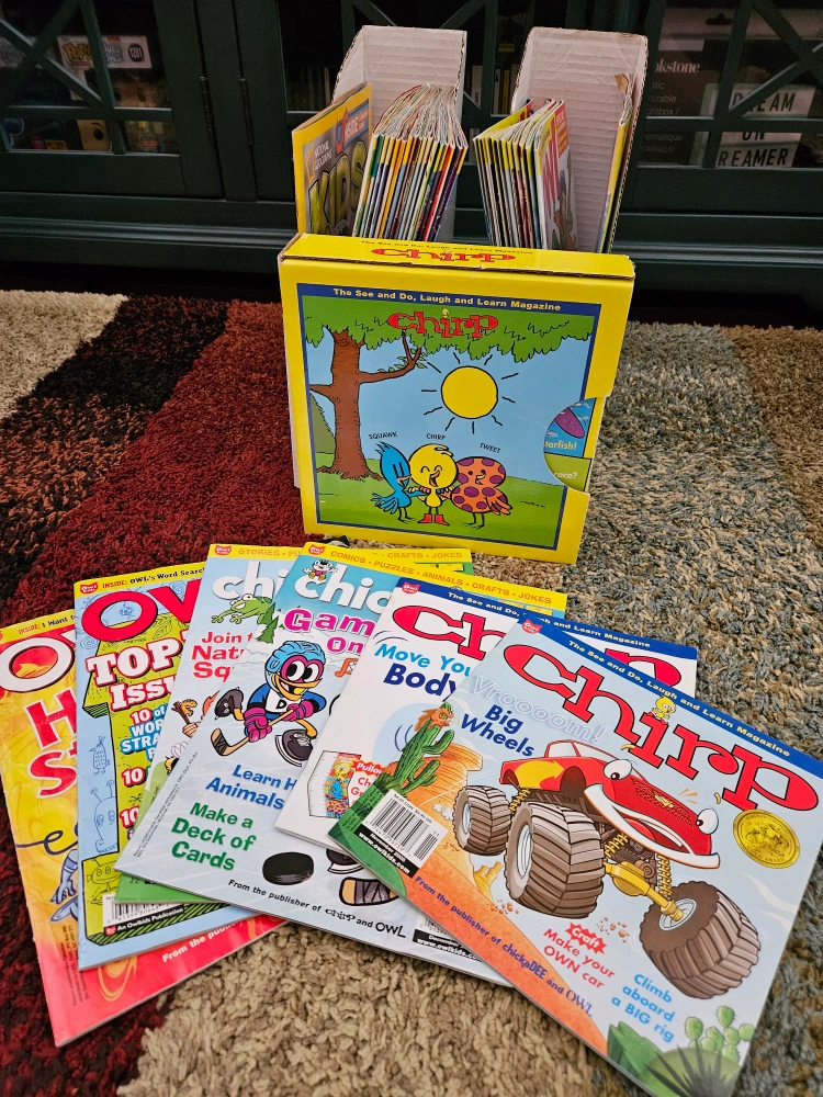 25We have a collection of Chirp, Chickadee, and OWL magazines! Dates are from the early 2000s to 2010. Some activities in the magazines have been completed, but overall they are in good condition. Would be great for daycare or preschool. Chirp magazines come with printed boxed holder. We live near Canada's Wonderland in Vaughan. Front porch pickup.