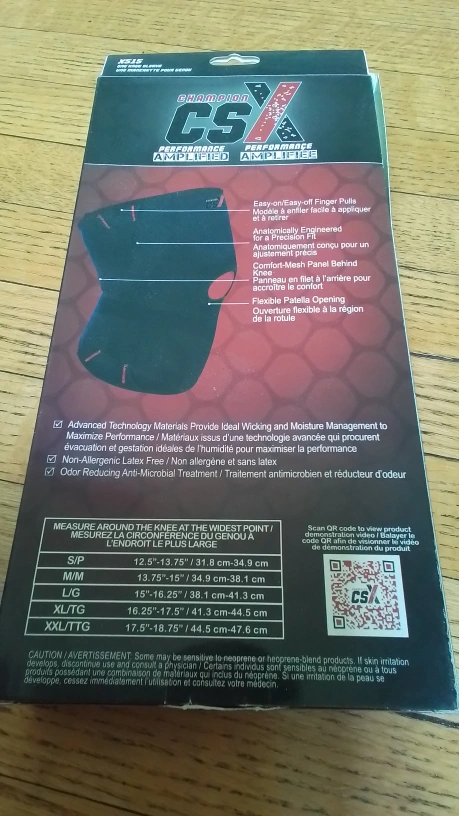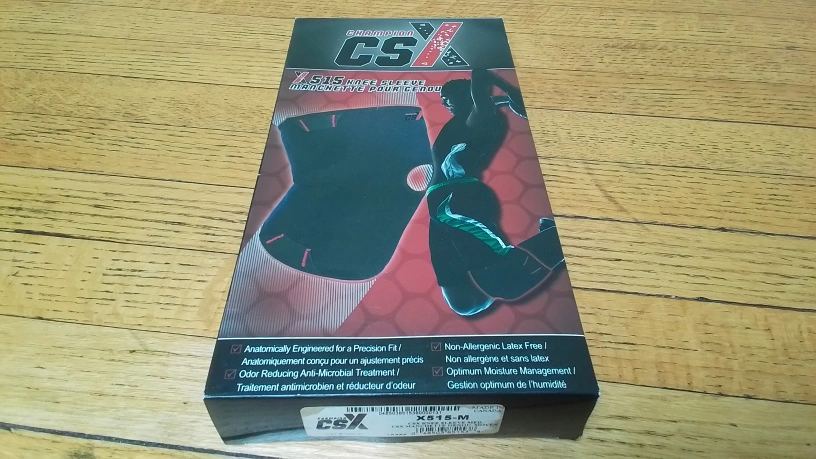 Champion CSX knee sleeve in size medium. It's anatomically engineered for a precision fit and has odour reducing anti-microbial treatment. The advanced technology materials provide ideal wicking and moisture management. It's also non-allergenic and latex-free. The box is included!
