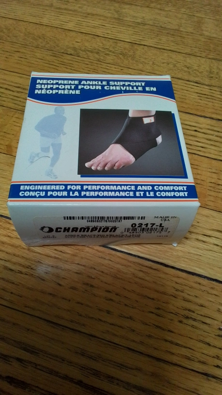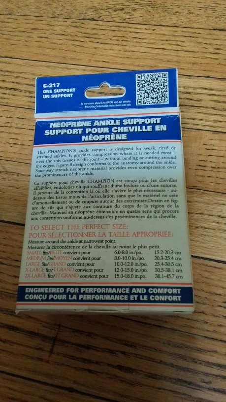 Champion Neoprene Ankle Support in size Large. This support is designed for weak, tired, or stressed ankles. It provides compression where it is needed most, over the soft tissues of the ankle, without binding. The four-way stretch neoprene material provides even compression over the prominence of the ankle. Comes with the original box