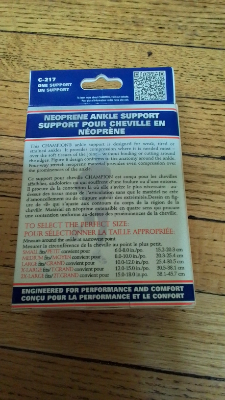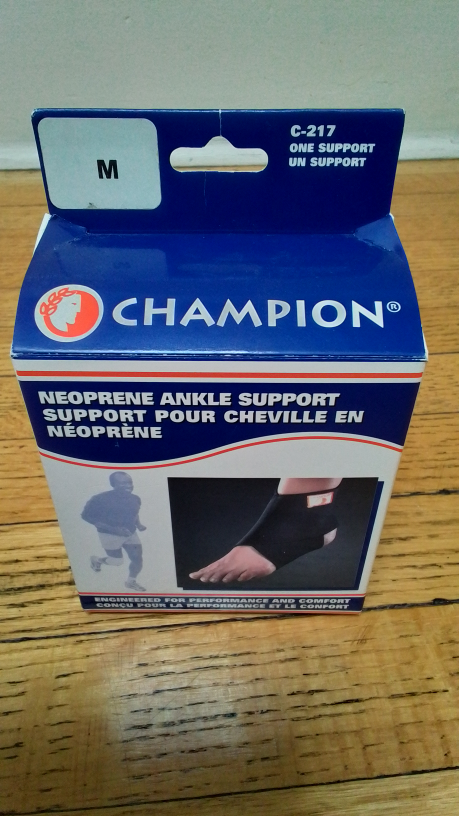 I have a Champion neoprene ankle support available. It's a size medium and comes in its original box. This support is designed for weak or strained ankles and provides compression where needed. It's engineered for performance and comfort!