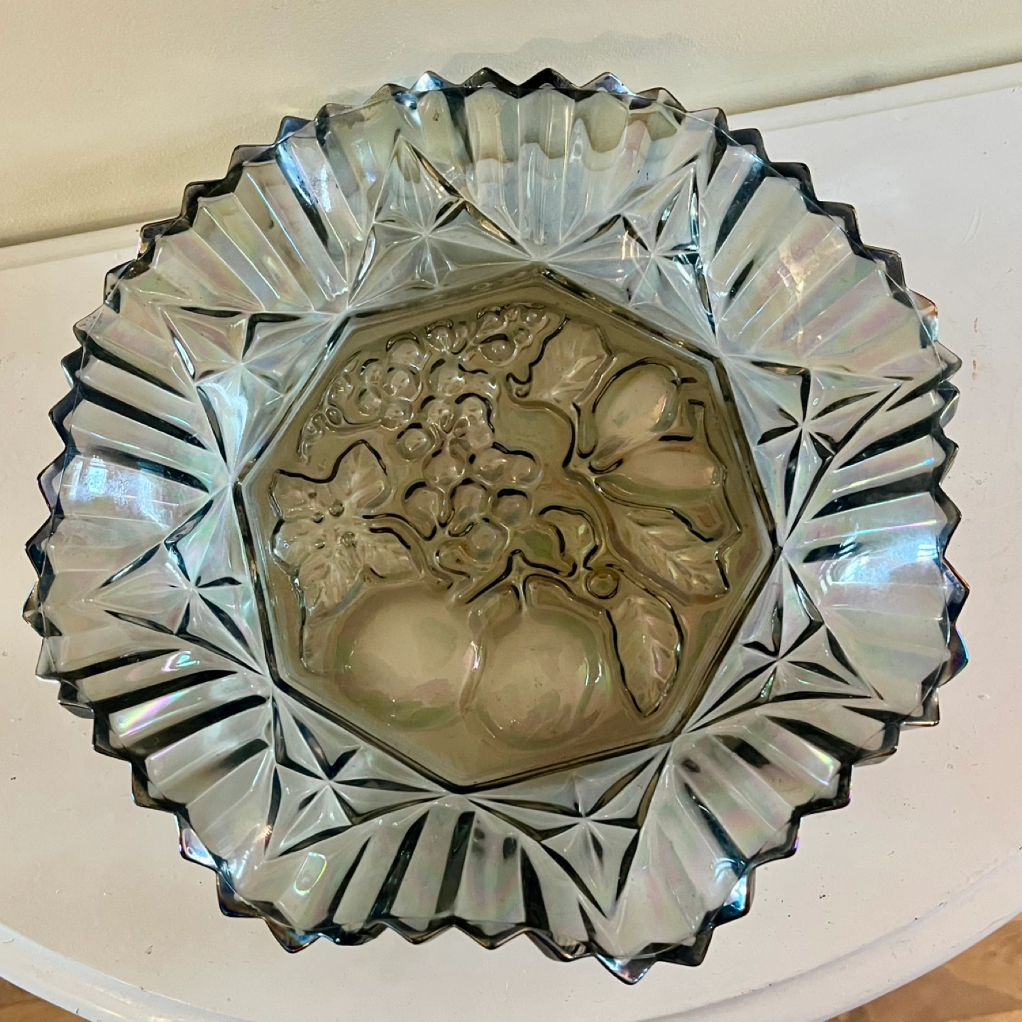 Federal Glass Pioneer Carnival crimped bowl with a stunning iridescent finish and fruit design. Lovely, unusual smoke colour. Good vintage condition. 10” diameter.