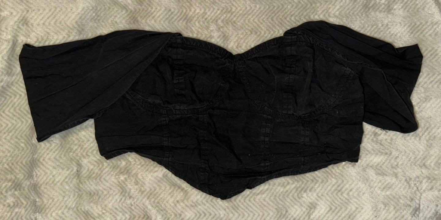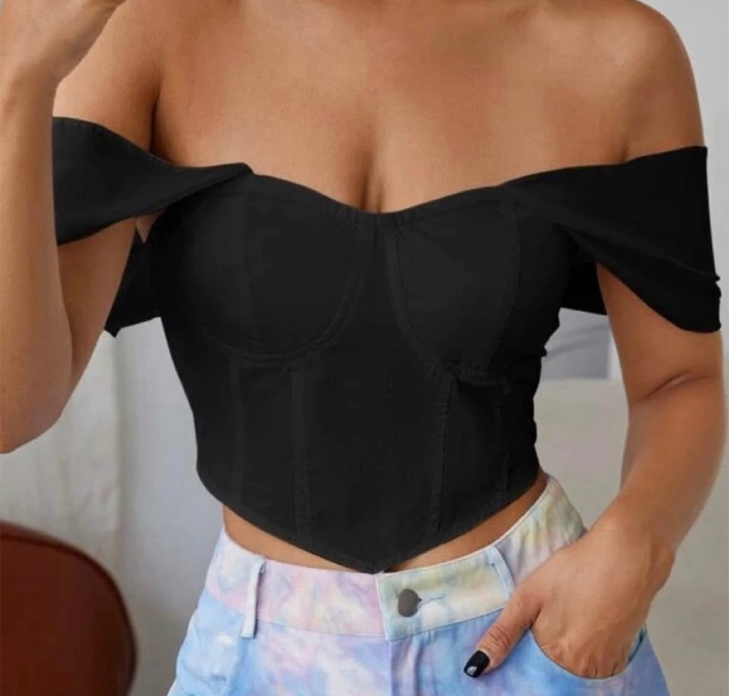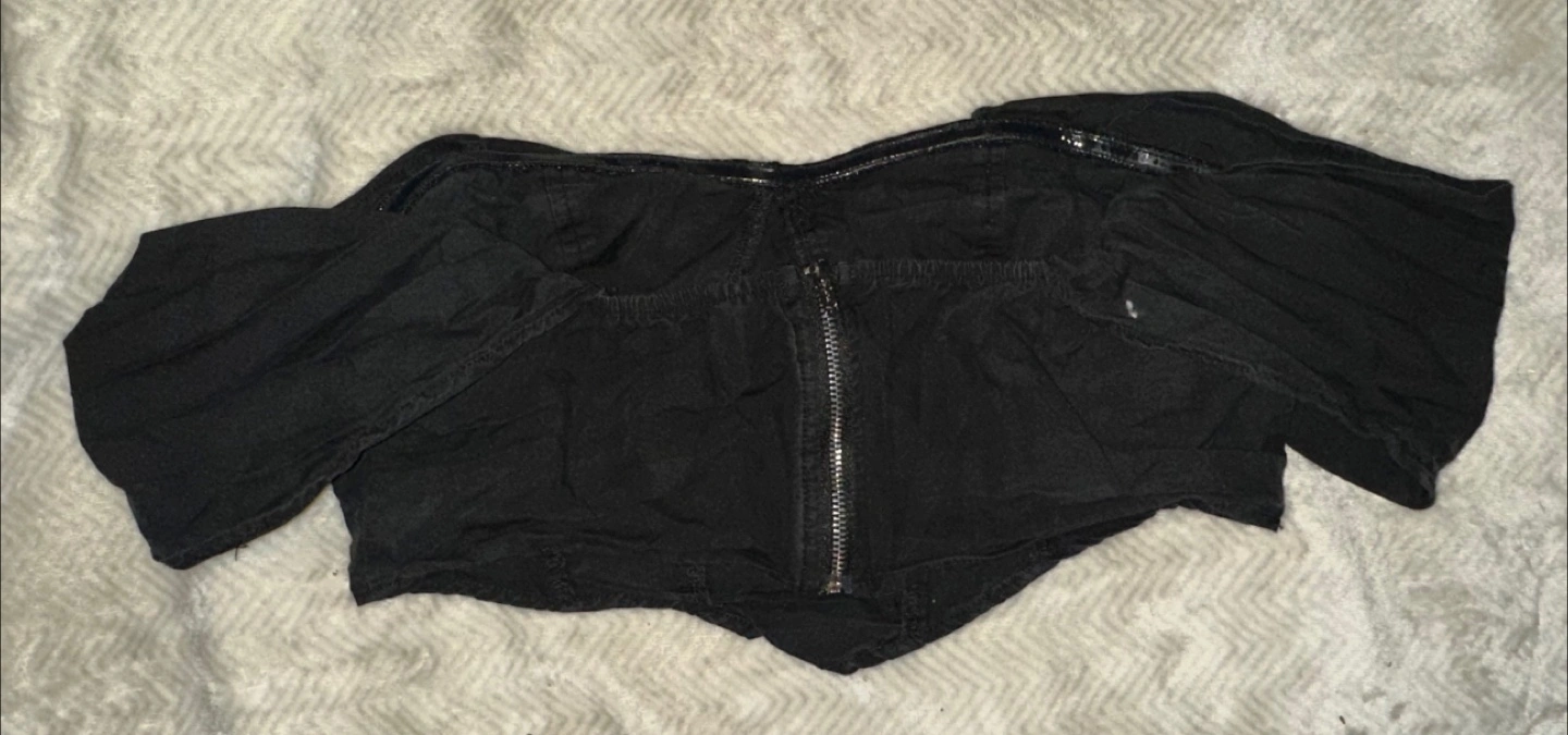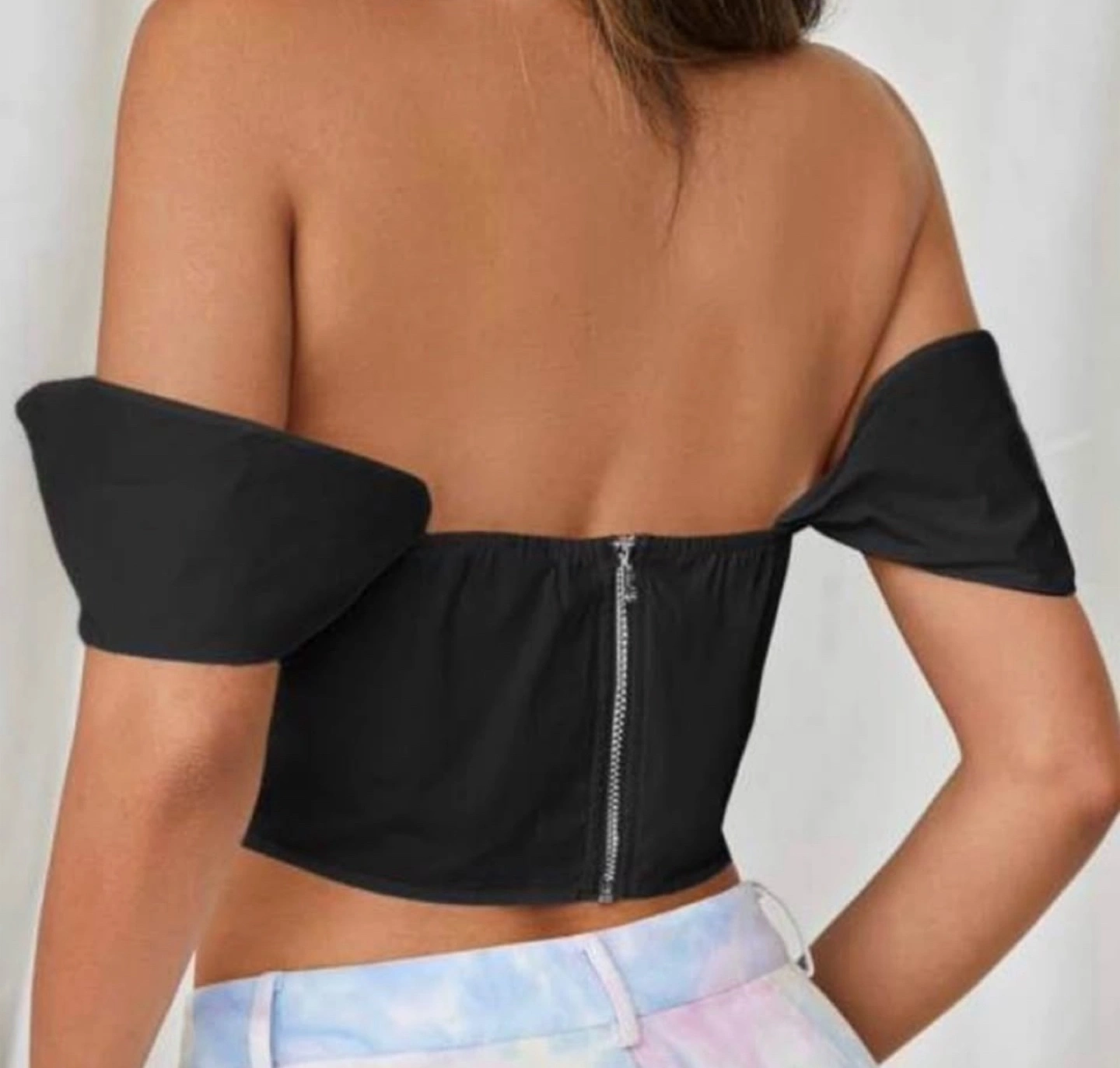 65Selling a cute black off-the-shoulder corset top! It has a zipper in the back. Perfect for a night out or a casual day.
