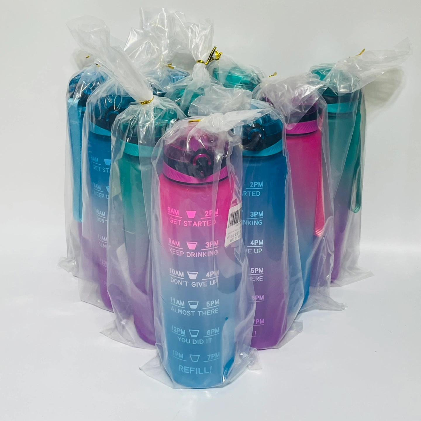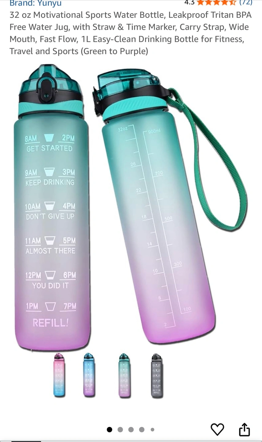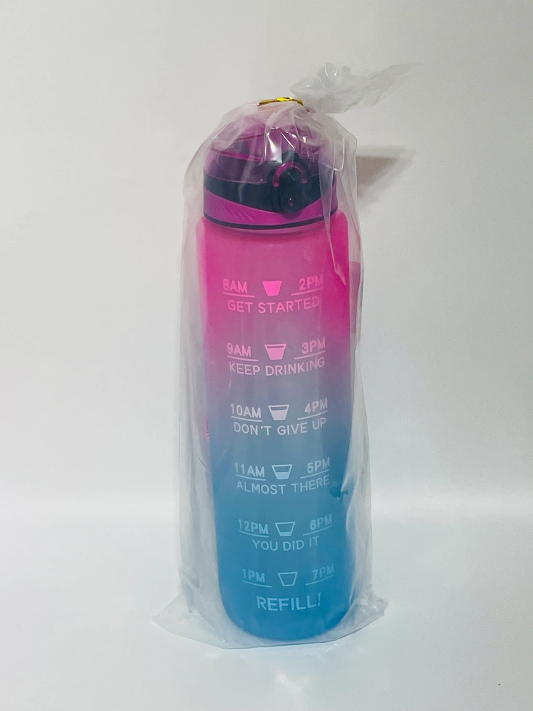 I'm selling a new gradient water bottle! It's designed to help you track your water intake throughout the day, with time markers from 8 AM to 7 PM. Perfect for staying hydrated this summer.