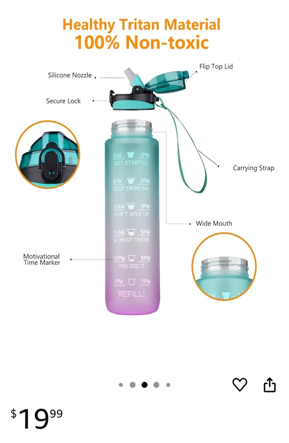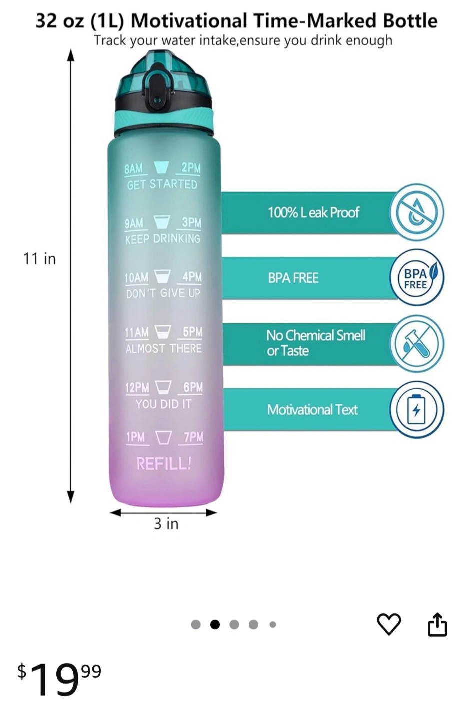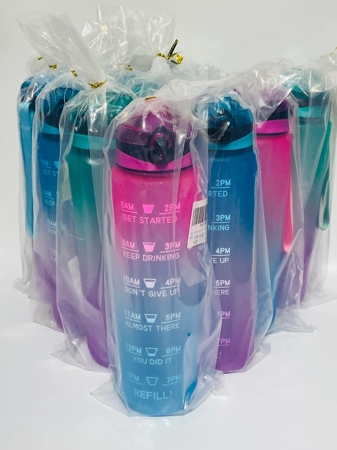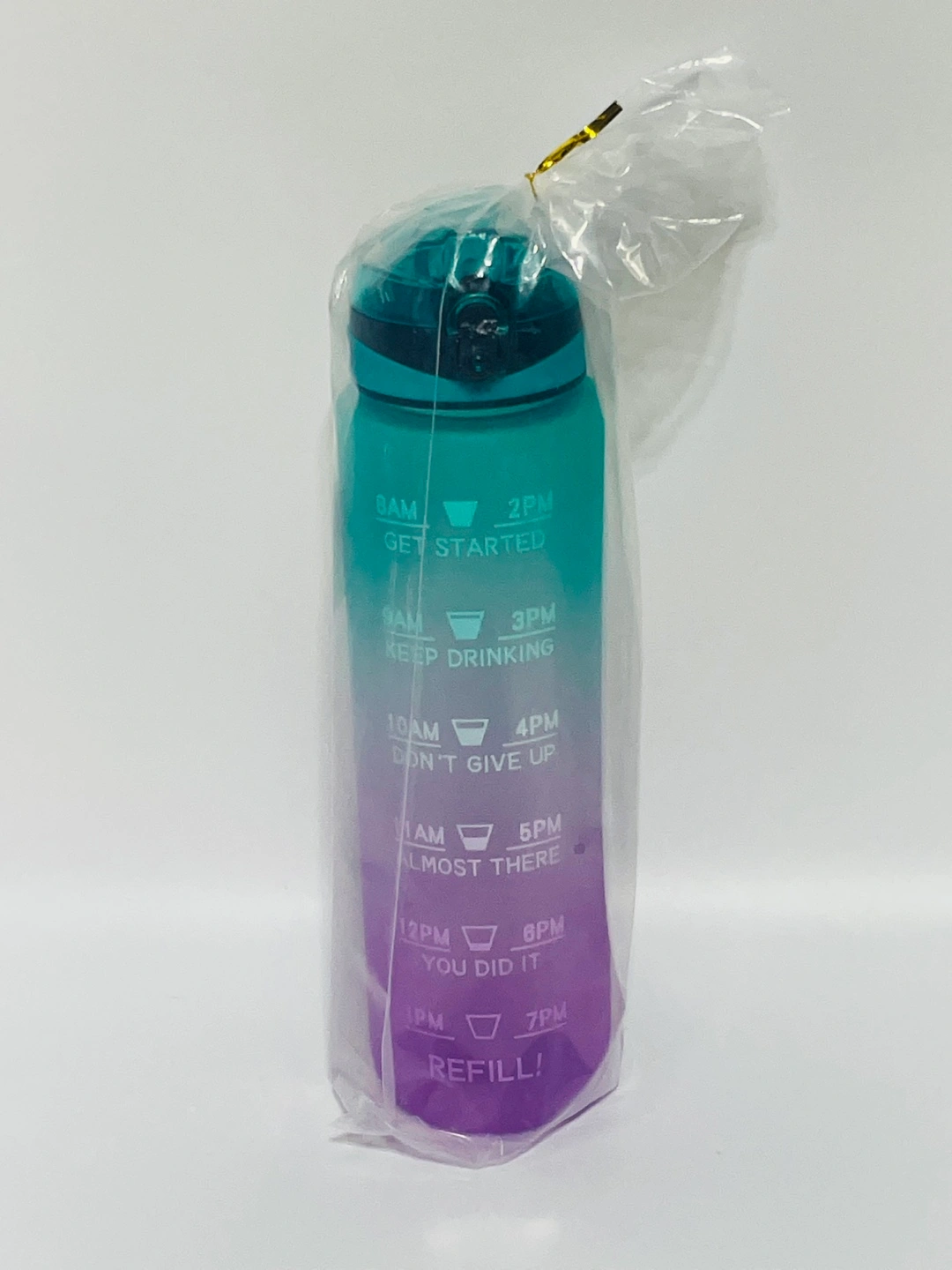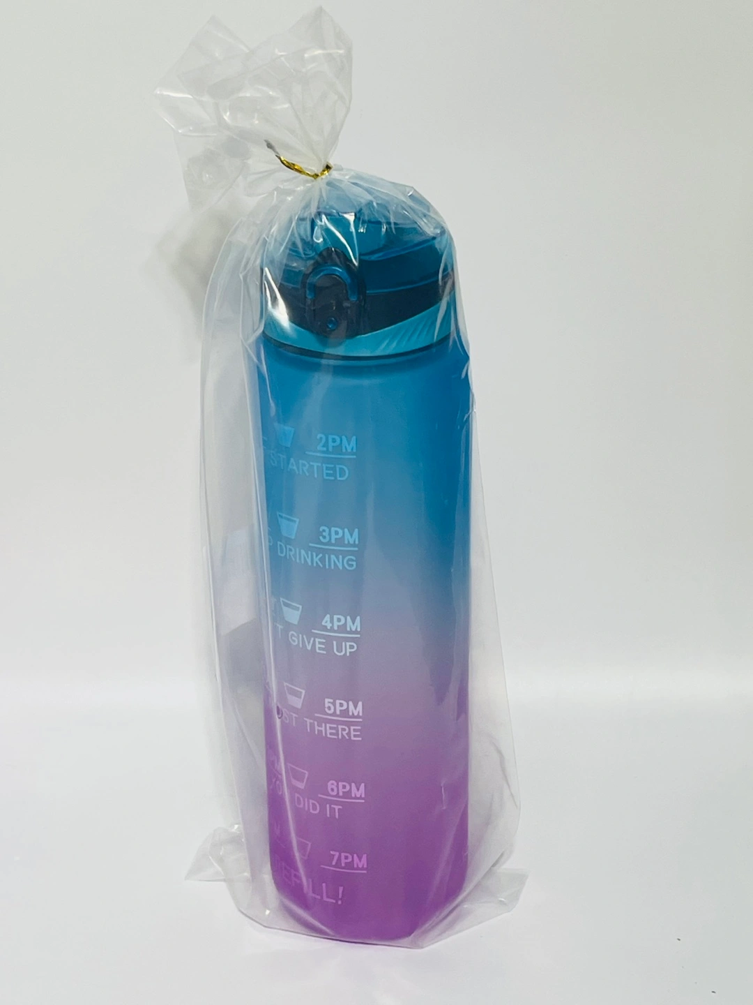 I'm selling a new gradient water bottle! It's designed to help you track your water intake throughout the day, with time markers from 8 AM to 7 PM. Perfect for staying hydrated this summer.