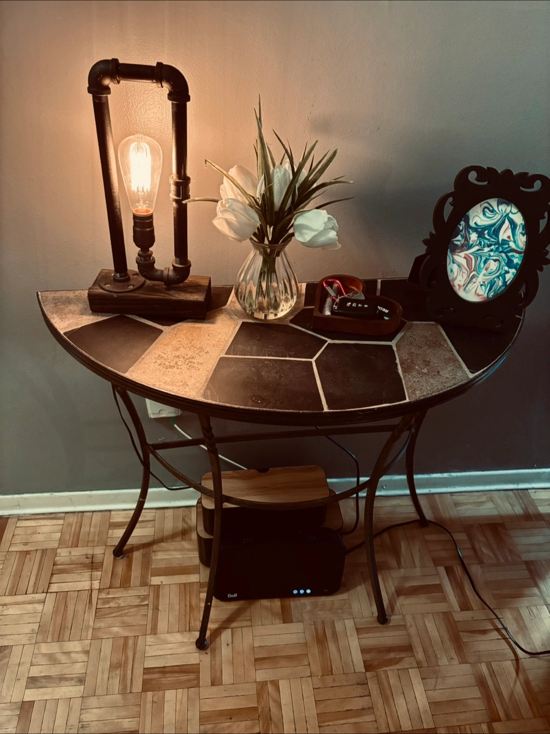A wrought iron table that could be used indoors or outside on the patio. Gray, beige and charcoal coloured tiles. Bought at Pier 1,